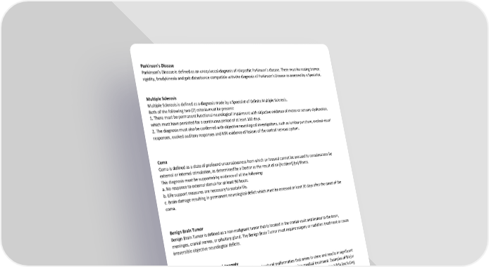 Parkinson’s Disease Parkinson’s Disease is defined as an unequivocal diagnosis of idiopathic Parkinson’s disease. There must be resting tremor, rigidity, bradykinesia and gait disturbance compatible with the diagnosis of Parkinson’s Disease as assessed by a Specialist. Multiple Sclerosis Multiple Sclerosis is defined as a diagnosis made by a Specialist of definite Multiple Sclerosis. Both of the following two (2) criteria must be present: 1. There must be permanent functional neurological impairment with objective evidence of motor or sensory dysfunction, which must have persisted for a continuous period of at least 180 days. 2. The diagnosis must also be confirmed with objective neurological investigations, such as lumbar puncture, evoked visual responses, evoked auditory responses and MRI evidence of lesions of the central nervous system. Coma Coma is defined as a state of profound unconsciousness from which an Insured cannot be aroused to consciousness by external or internal stimulation, as determined by a Doctor as the result of an [Accident] [or] Illness. This diagnosis must be supported by evidence of all the following: a. No response to external stimuli for at least 96 hours. b. Life support measures are necessary to sustain life. c. Brain damage resulting in permanent neurological deficit which must be assessed at least 30 days after the onset of the coma. Benign Brain Tumor Benign Brain Tumor is defined as a non-malignant tumor that is located in the cranial vault and limited to the brain, meninges, cranial nerves, or pituitary gland. The Benign Brain Tumor must require surgery or radiation treatment or cause irreversible objective neurological deficits. Major Congenital Structural Anomaly Major Congenital Structural Anomaly is defined as a structural malformation that arises in utero and results in significant medical, social or cosmetic consequences for the affected individual, and requires medical treatment. Examples of Major Congenital Structural Anomalies include, but are not limited to, complex congenital heart disease, spina bifida (excluding occulta), cleft lip/palate, anencephaly, omphalocele, and club foot. A Major Congenital Structural Anomaly must be diagnosed and named by a Specialist according to clinically accepted diagnostic criteria. The Specialist must establish a treatment plan specific to the condition. Congenital Metabolic Disorder Congenital Metabolic Disorder is defined as a genetic or inherited disorder resulting from an enzyme defect in biochemical and metabolic pathways affecting proteins, fats, carbohydrates metabolism or impaired organelle function presenting as complicated medical conditions involving several human organ systems. Examples of Congenital Metabolic Disorders include, but are not limited to, phenylalanine hydroxylase deficiency, Niemann-Pick, Tay Sachs, Gaucher's Disease, phenylketonuria, and cystic fibrosis. A Congenital Metabolic Disorder must be diagnosed and named by a Specialist according to clinically accepted diagnostic criteria. The Specialist must establish a treatment plan specific to the condition.