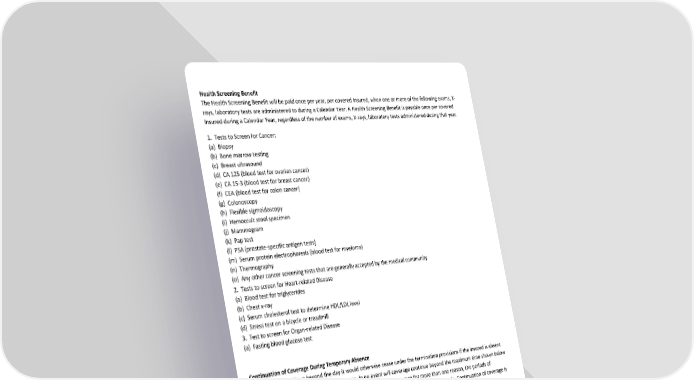 Health Screening Benefit The Health Screening Benefit will be paid once per year, per covered Insured, when one or more of the following exams, X- rays, laboratory tests are administered to during a Calendar Year. A Health Screening Benefit is payable once per covered Insured during a Calendar Year, regardless of the number of exams, X-rays, laboratory tests administered during that year. 1. Tests to Screen for Cancer: (a) Biopsy (b) Bone marrow testing (c) Breast ultrasound (d) CA 125 (blood test for ovarian cancer) (e) CA 15-3 (blood test for breast cancer) (f) CEA (blood test for colon cancer) (g) Colonoscopy (h) Flexible sigmoidoscopy (i) Hemoccult stool specimen (j) Mammogram (k) Pap test (l) PSA (prostate-specific antigen tests) (m) Serum protein electrophoresis (blood test for myeloma) (n) Thermography (o) Any other cancer screening tests that are generally accepted by the medical community 2. Tests to screen for Heart-related Disease (a) Blood test for triglycerides (b) Chest x-ray (c) Serum cholesterol test to determine HDL/LDL level (d) Stress test on a bicycle or treadmill 3. Test to screen for Organ-related Disease (a) Fasting blood glucose test Continuation of Coverage During Temporary Absence Coverage may continue beyond the day it would otherwise cease under the termination provisions if the insured is absent from work due to any of the following reasons. In no event will coverage continue beyond the maximum time shown below for any temporary absence. If the insured is eligible to continue coverage for more than one reason, the periods of continuation will run concurrently. The continuation periods may not be applied consecutively. Continuation of coverage is subject to the payment of required premium. Illness or Injury If absent from work due to illness or injury, all coverage may be continued for a period of 6 consecutive months from the date last actively at work. Personal Leave of Absence If on a documented leave of absence, all coverage may be continued for up to 2 months following the date last actively at work. If the leave terminates prior to the agreed upon date, this continuation will cease immediately.