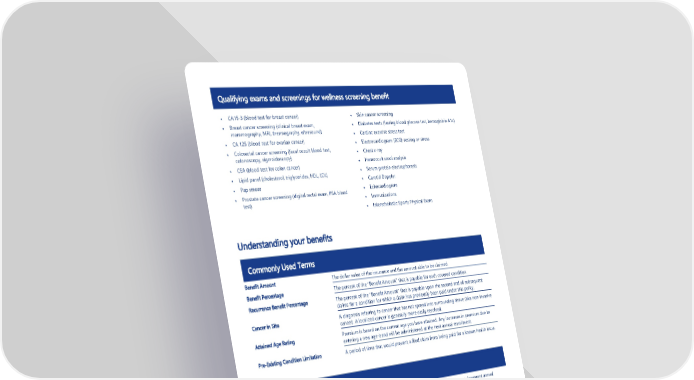 Page 3 • CA15-3 (blood test for breast cancer) • Breast cancer screening (clinical breast exam, mammography, MRI, thermography, ultrasound) • CA 125 (blood test for ovarian cancer) • Colorectal cancer screening (fecal occult blood test, colonoscopy, sigmoidoscopy) • CEA (blood test for colon cancer) • Lipid panel (cholesterol, triglycerides, HDL, LDL) • Pap smear • Prostate cancer screening (digital rectal exam, PSA blood test) Qualifying exams and screenings for wellness screening benefit • Skin cancer screening • Diabetes tests (fasting blood glucose test, hemoglobin A1c) • Cardiac exercise stress test • Electrocardiogram (ECG)-resting or stress • Chest x-ray • Hemoccult stool analysis • Serum protein electrophoresis • Carotid Doppler • Echocardiogram • Immunizations • Interscholastic Sports Physical Exam Understanding your benefits Commonly Used Terms Benefit Amount The dollar value of the insurance and the amount able to be claimed. Benefit Percentage The percent of the “Benefit Amount” that is payable for each covered condition. Recurrence Benefit Percentage The percent of the “Benefit Amount” that is payable upon the second and all subsequent claims for a condition for which a claim has previously been paid under this policy. Cancer in Situ A diagnosis referring to cancer that has not spread into surrounding tissue (aka non-invasive cancer). A localized cancer is generally more easily resolved. Attained Age Rating Premium is based on the current age you have attained. Any increases in premium due to entering a new age-band will be administered at the next annual enrollment. Pre-Existing Condition Limitation A period of time that would prevent a filed claim from being paid for a known health issue. Frequently Asked Questions When can I enroll? You can enroll when you are initially eligible for benefits and any subsequent annual enrollment or life status change. Are my dependent children eligible for coverage? Yes, dependent children are eligible up to end of the month they reach age 26. If any dependent children are developmentally disabled, you are able to continue coverage beyond age 26. Do benefits have to be used for medical expenses? You decide how to use your benefit payment: • Out-of-pocket medical costs, including deductibles and co-pays • Rehab costs • Rent or mortgage payments • Groceries • Utility or credit card bills • Childcare • Other financial support What is critical illness insurance? Group critical illness insurance is designed to pay a lump sum cash benefit when an insured is diagnosed with a covered condition (i.e. heart attack, stroke, cancer, etc.). The covered conditions are common and typically are survivable diagnosis. • • • • • • • • • • • • • • • • • • • • • • • • • •