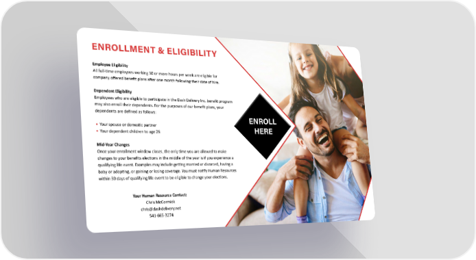 ENROLLMENT & ELIGIBILITY Employee Eligibility All full-time employees working 30 or more hours per week are eligible for company offered benefit plans after one month following their date of hire. Dependent Eligibility Employees who are eligible to participate in the Dash Delivery Inc. benefit program may also enroll their dependents. For the purposes of our benefit plans, your dependents are defined as follows: Your spouse or domestic partner Your dependent children to age 26 Mid-Year Changes Once your enrollment window closes, the only time you are allowed to make changes to your benefits elections in the middle of the year is if you experience a qualifying life event. Examples may include getting married or divorced, having a baby or adopting, or gaining or losing coverage. You must notify Human Resources within 30 days of qualifying life event to be eligible to change your elections. Your Human Resource Contact: Chris McCormick chris@dashdelivery.net 541-665-3274 ENROLL HERE