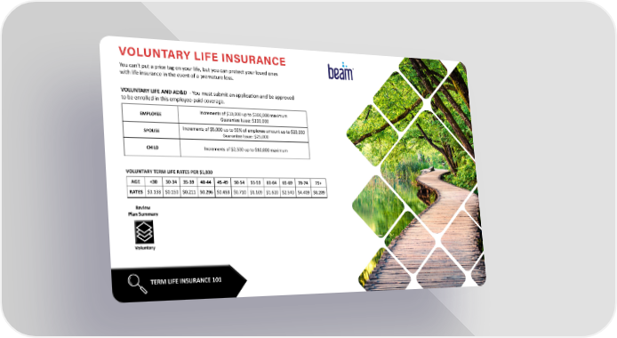 VOLUNTARY LIFE INSURANCE You can't put a price tag on your life, but you can protect your loved ones with life insurance in the event of a premature loss. VOLUNTARY LIFE AND AD&D - You must submit an application and be approved to be enrolled in this employee-paid coverage. EMPLOYEE Increments of $10,000 up to $300,000 maximum Guarantee Issue: $100,000 SPOUSE Increments of $5,000 up to 50% of employee amount up to $20,000 Guarantee Issue: $25,000 CHILD Increments of $2,500 up to $10,000 maximum TERM LIFE INSURANCE 101 Voluntary Review Plan Summary AGE <30 30-34 35-39 40-44 45-49 50-54 55-59 60-64 65-69 70-74 75+ RATES $0.138 $0.150 $0.211 $0.296 $0.453 $0.710 $1.109 $1.620 $2.540 $4.409 $8.209 VOLUNTARY TERM LIFE RATES PER $1,000