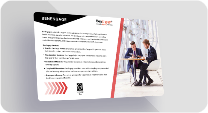 BenEngage Flyer BENENGAGE BenEngage is a benefits support and concierge service for employees, offering guidance on health insurance, benefits education, and assistance with complex healthcare and billing issues. They provide personalized support to help employees and their families understand and utilize their benefits, acting as an extension of their employers HR department. BenEngage Services: Benefits Concierge Service: Employees can contact BenEngage with questions about their benefits, claims, and healthcare resources. Plan Selection Guidance: BenEngage helps employees choose health insurance plans that best fit their individual and family needs. Educational Materials: They provide resources to help employees understand their coverage options. Complex Bill Resolution: BenEngage specialists assist with untangling complex medical bills and working with providers and insurance partners for resolution. Employee Advocacy: They act as advocates for employees to help them utilize their healthcare resources efficiently.
