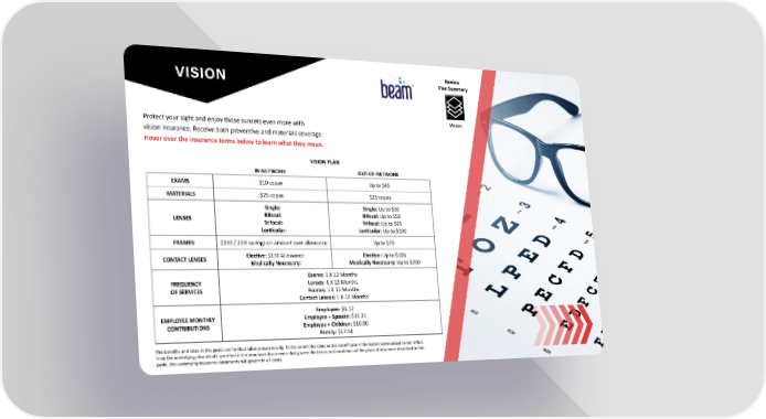 VISION Protect your sight and enjoy those sunsets even more with vision insurance. Receive both preventive and materials coverage. Hover over the insurance terms below to learn what they mean. VISION PLAN IN-NETWORK OUT-OF-NETWORK EXAMS $10 copay Up to $45 MATERIALS $25 copay $25 copay LENSES Single: Bifocal: Trifocal: Lenticular: Single: Up to $30 Bifocal: Up to $50 Trifocal: Up to $65 Lenticular: Up to $100 FRAMES $130 / 20% savings on amount over allowance Up to $70 CONTACT LENSES Elective: $130 Allowance Medically Necessary: Elective: Up to $105 Medically Necessary: Up to $210 FREQUENCY OF SERVICES Exams: 1 X 12 Months Lenses: 1 X 12 Months Frames: 1 X 12 Months Contact Lenses: 1 X 12 Months EMPLOYEE MONTHLY CONTRIBUTIONS Employee: $5.12 Employee + Spouse: $10.31 Employee + Children: $10.90 Family: $17.14 The benefits and rates in this guide are for illustrative purposes only. To the extent the rates or the benefit plan information summarized herein differs from the underlying plan details specified in the insurance documents that govern the terms and conditions of the plans of insurance described in this guide, the underlying insurance documents will govern in all cases. Vision Review Plan Summary
