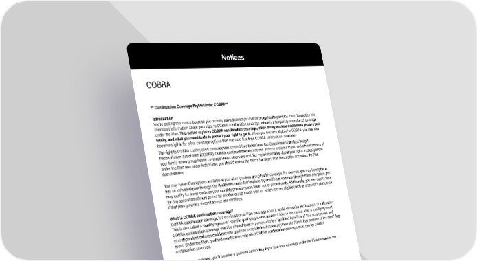 ** Continuation Coverage Rights Under COBRA** Introduction Youre getting this notice because you recently gained coverage under a group health plan (the Plan). This notice has important information about your right to COBRA continuation coverage, which is a temporary extension of coverage under the Plan. This notice explains COBRA continuation coverage, when it may become available to you and your family, and what you need to do to protect your right to get it. When you become eligible for COBRA, you may also become eligible for other coverage options that may cost less than COBRA continuation coverage. The right to COBRA continuation coverage was created by a federal law, the Consolidated Omnibus Budget Reconciliation Act of 1985 (COBRA). COBRA continuation coverage can become available to you and other members of your family when group health coverage would otherwise end. For more information about your rights and obligations under the Plan and under federal law, you should review the Plans Summary Plan Description or contact the Plan Administrator. You may have other options available to you when you lose group health coverage. For example, you may be eligible to buy an individual plan through the Health Insurance Marketplace. By enrolling in coverage through the Marketplace, you may qualify for lower costs on your monthly premiums and lower out-of-pocket costs. Additionally, you may qualify for a 30-day special enrollment period for another group health plan for which you are eligible (such as a spouses plan), even if that plan generally doesnt accept late enrollees. What is COBRA continuation coverage? COBRA continuation coverage is a continuation of Plan coverage when it would otherwise end because of a life event. This is also called a qualifying event. Specific qualifying events are listed later in this notice. After a qualifying event, COBRA continuation coverage must be offered to each person who is a qualified beneficiary. You, your spouse, and your dependent children could become qualified beneficiaries if coverage under the Plan is lost because of the qualifying event. Under the Plan, qualified beneficiaries who elect COBRA continuation coverage must pay for COBRA continuation coverage. If youre an employee, youll become a qualified beneficiary if you lose your coverage under the Plan because of the following qualifying events: Your hours of employment are reduced, or Your employment ends for any reason other than your gross misconduct. If youre the spouse of an employee, youll become a qualified beneficiary if you lose your coverage under the Plan because of the following qualifying events: Your spouse dies; Your spouses hours of employment are reduced; Your spouses employment ends for any reason other than his or her gross misconduct; Your spouse becomes entitled to Medicare benefits (under Part A, Part B, or both); or You become divorced or legally separated from your spouse. COBRA Notices 2