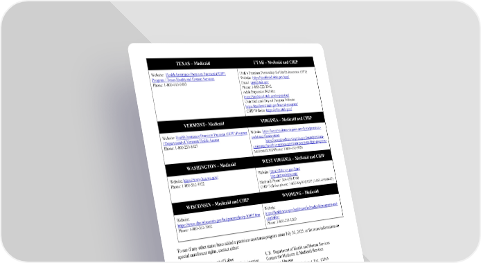 TEXAS Medicaid UTAH Medicaid and CHIP Website: Health Insurance Premium Payment (HIPP) Program | Texas Health and Human Services Phone: 1-800-440-0493 Utahs Premium Partnership for Health Insurance (UPP) Website: https://medicaid.utah.gov/upp/ Email: [email protected] Phone: 1-888-222-2542 Adult Expansion Website: https://medicaid.utah.gov/expansion/ Utah Medicaid Buyout Program Website: https://medicaid.utah.gov/buyout-program/ CHIP Website: https://chip.utah.gov/ VERMONT Medicaid VIRGINIA Medicaid and CHIP Website: Health Insurance Premium Payment (HIPP) Program | Department of Vermont Health Access Phone: 1-800-250-8427 Website: https://coverva.dmas.virginia.gov/learn/premium- assistance/famis-select https://coverva.dmas.virginia.gov/learn/premium- assistance/health-insurance-premium-payment-hipp-programs Medicaid/CHIP Phone: 1-800-432-5924 WASHINGTON Medicaid WEST VIRGINIA Medicaid and CHIP Website: https://www.hca.wa.gov/ Phone: 1-800-562-3022 Website: https://dhhr.wv.gov/bms/ http://mywvhipp.com/ Medicaid Phone: 304-558-1700 CHIP Toll-free phone: 1-855-MyWVHIPP (1-855-699-8447) WISCONSIN Medicaid and CHIP WYOMING Medicaid Website: https://www.dhs.wisconsin.gov/badgercareplus/p-10095.htm Phone: 1-800-362-3002 Website: https://health.wyo.gov/healthcarefin/medicaid/programs-and- eligibility/ Phone: 1-800-251-1269 To see if any other states have added a premium assistance program since July 31, 2025, or for more information on special enrollment rights, contact either: U.S. Department of Labor U.S. Department of Health and Human Services Employee Benefits Security Administration Centers for Medicare & Medicaid Services www.dol.gov/agencies/ebsa www.cms.hhs.gov 1-866-444-EBSA (3272) 1-877-267-2323, Menu Option 4, Ext. 61565 Paperwork Reduction Act Statement According to the Paperwork Reduction Act of 1995 (Pub. L. 104-13) (PRA), no persons are required to respond to a collection of information unless such collection displays a valid Office of Management and Budget (OMB) control number. The Department notes that a Federal agency cannot conduct or sponsor a collection of information unless it is approved by OMB under the PRA, and displays a currently valid OMB control number, and the public is not required to respond to a collection of information unless it displays a currently valid OMB control number. See 44 U.S.C. 3507. Also, notwithstanding any other provisions of law, no person shall be subject to penalty for failing to comply with a collection of information if the collection of information does not display a currently valid OMB control number. See 44 U.S.C. 3512. The public reporting burden for this collection of information is estimated to average approximately seven minutes per respondent. Interested parties are encouraged to send comments regarding the burden estimate or any other aspect of this collection of information, including suggestions for reducing this burden, to the U.S. Department of Labor, Employee Benefits Security Administration, Office of Policy and Research, Attention: PRA Clearance Officer, 200 Constitution Avenue, N.W., Room N-5718, Washington, DC 20210 or email [email protected] and reference the OMB Control Number 1210-0137. OMB Control Number 1210-0137 (expires 1/31/2026) 10