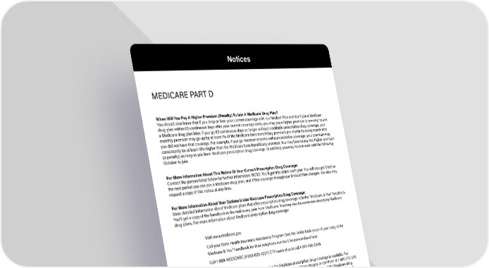 When Will You Pay A Higher Premium (Penalty) To Join A Medicare Drug Plan? You should also know that if you drop or lose your current coverage with our Medical Plan and dont join a Medicare drug plan within 63 continuous days after your current coverage ends, you may pay a higher premium (a penalty) to join a Medicare drug plan later. If you go 63 continuous days or longer without creditable prescription drug coverage, your monthly premium may go up by at least 1% of the Medicare base beneficiary premium per month for every month that you did not have that coverage. For example, if you go nineteen months without creditable coverage, your premium may consistently be at least 19% higher than the Medicare base beneficiary premium. You may have to pay this higher premium (a penalty) as long as you have Medicare prescription drug coverage. In addition, you may have to wait until the following October to join. For More Information About This Notice Or Your Current Prescription Drug Coverage: Contact the person listed below for further information. NOTE: Youll get this notice each year. You will also get it before the next period you can join a Medicare drug plan, and if this coverage through our Medical Plan changes. You also may request a copy of this notice at any time. For More Information About Your Options Under Medicare Prescription Drug Coverage: More detailed information about Medicare plans that offer prescription drug coverage is in the Medicare & You handbook. Youll get a copy of the handbook in the mail every year from Medicare. You may also be contacted directly by Medicare drug plans. For more information about Medicare prescription drug coverage: Visit www.medicare.gov Call your State Health Insurance Assistance Program (see the inside back cover of your copy of the Medicare & You handbook for their telephone number) for personalized help Call 1-800-MEDICARE (H300-633-4227) TTY users should call 1-877-486-2048. If you have limited income and resources, extra help paying for Medicare prescription drug coverage is available. For information about this extra help, visit Social Security on the web at www.socialsecurity.gov, or call them at 1-800-772-1213 (TTY 1-800-325-0778). Remember, keep this creditable coverage notice. If you decide to join one of the Medicare drug plans, you may be required to provide a copy of this notice when you join to show whether or not you have maintained creditable coverage and, therefore, whether or not you are required to pay a higher premium (a penalty). MEDICARE PART D Notices 6