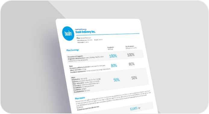 This benefit summary is not a complete description of the insurance coverage. Controlling provisions are provided in the policy, and this summary does not modify those provisions or the insurance in any way. This is not a binding contract. A certificate of coverage will be made available to you that describes the benefits in greater details. Should there be a difference between this summary and the contract, the contract will govern. Dental insurance product underwritten by National Guardian Life Insurance Company (NGL), Madison, WI, marketed by Beam Insurance Services LLC (Beam Benefits Insurance Services LLC, in CA). Dental policy form number NDNGRP 2020. Dental product underwritten by Nationwide Life Insurance Company, Columbus, OH in NY, DE, ID, LA, UT, OH, TX and NM. Dental coverage applicable to policy form GDTL AO L20, or state equivalent. Dental product administered by Beam Insurance Administrators LLC (Beam Dental Insurance Administrators LLC, in Texas). Not all Products Available in All States. Two life groups made up of only a husband-wife, domestic partners or same-sex couple are not eligible for coverage. National Guardian Life Insurance Company, Madison, WI, is not affiliated with The Guardian Life Insurance Company of America, a.k.a. The Guardian, or Guardian Life. Nationwide and Beam Insurance Services LLC are separate and non-affiliated companies. National Guardian Life Insurance Company, Two East Gilman, Madison, Wisconsin 53703 Nationwide Life Insurance Company, One Nationwide Plaza, Columbus, OH 43215 FIND A DENTIST QUESTIONS? CHECK CLAIMS & ELIGIBILITY dentists.beambenefits.com support@beambenefits.com app.beambenefits.com/providers BM-SOB-0035-202306 3 of 3