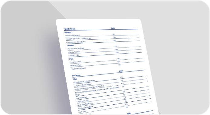 Page 9 Preventive Services Benefit Evaluations • Periodic Oral Evaluation 100% • Limited Oral Evaluation – problem focused 100% • Comprehensive Oral Evaluation 100% Treatments • Routine Dental Prophylaxis 100% • Fluoride Treatment 100% • Sealants – child 100% X-Rays • Periapical X-Rays 100% • Bitewing X-Rays 100% Periodontal Maintenance 100% Basic Services Benefit X-Rays • Complete Series/ Panoramic X-Rays 80% Emergency Palliative Treatment 80% Surgical Extractions and Removal of Impacted Teeth 80% Basic Restorative Services (amalgam, composite resin, acrylic, synthetic or plastic fillings) 80% Simple Extractions 80% Surgical Endodontics 80% Non-Surgical Endodontics 80% Non-Surgical Periodontal 80% Oral Surgery 80% Periodontal Surgery 80% Major Services Benefit Inlays/Onlays/Crowns 50% Dentures – complete, partial, overdenture (upper and lower) 50% Implants 50% Bridges 50% Orthodontic Services Benefit Child Orthodontic Services 50%