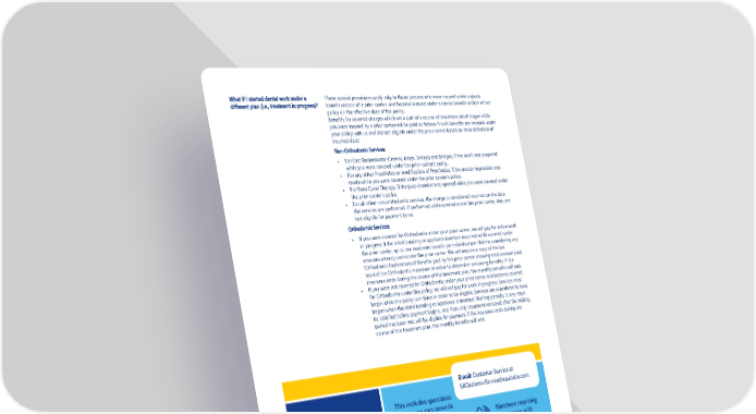 Page 5 What if I started dental work under a different plan (i.e., treatment in progress)? These special provisions apply only to those persons who were insured under a given benefit section of a prior carrier, and become insured under a similar benefit section of our policy on the effective date of the policy. Benefits for covered charges which are a part of a course of treatment which began while you were insured by a prior carrier will be paid as follows if such benefits are covered under your policy with us and are not eligible under the prior carrier based on their definition of incurred date: Non-Orthodontic Services: • For Cast Restorations (Crowns, Inlays, Onlays) and Bridges, if the tooth was prepared while you were covered under the prior carrier’s policy. • For any other Prosthetics or modification of Prosthetics, if the master impression was made while you were covered under the prior carrier’s policy. • For Root Canal Therapy, if the pulp chamber was opened while you were covered under the prior carrier’s policy. • For all other non-orthodontic services, the charge is considered incurred on the date the services are performed. If performed while covered under the prior carrier, they are not eligible for payment by us. Orthodontic Services: • If you were covered for Orthodontia under your prior carrier, we will pay for active work in progress if the initial banding or appliance insertion occurred while covered under the prior carrier, up to our maximum benefit per individual per lifetime considering any amounts already paid under the prior carrier. We will require a copy of the last Orthodontic Explanation of Benefits paid by the prior carrier showing total amount paid toward the Orthodontic maximum in order to determine remaining benefits. If the insurance ends during the course of the treatment plan, the monthly benefits will end. • If you were not covered for Orthodontia under your prior carrier and become covered for Orthodontia under this policy, we will not pay for work in progress. Services must begin while this policy is in force in order to be eligible. Services are considered to have begun when the initial banding or appliance is inserted. Waiting periods, if, any, must be satisfied before payment begins, and then only treatment rendered after the waiting period has been met will be eligible for payment. If the insurance ends during the course of the treatment plan, the monthly benefits will end. Center for Disease Control and Prevention. (2020). Adult Oral 1 Restorations or appliances used for the purpose of periodontal (10) • • • • • •