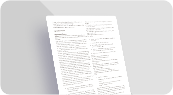 Page 13 Center for Disease Control and Prevention. (2020). Adult Oral 1 Health. Retrieved from: Https://www.cdc.gov Center for Disease Control and Prevention. (2020). Children’s Oral 2 Health. Retrieved from: Https://www.cdc.gov Important Information Limitations and Exclusions Payment of benefits is limited under this certificate as Limitations: shown below. Refer to certificate of coverage for full limitations and exclusions. Orthodontic services must begin while this insurance is in force. (1) If the insurance ends during the course of the treatment plan, the monthly benefits will end. Services are considered to have begun when the initial banding or appliance is inserted. Services must begin after the end of any applicable waiting (2) period. Waiting periods for each category of service shown in your certificate of coverage. When multiple dental services of similar types are provided, the (3) frequency limit under the plan will combine all the similar types of services under the stated frequency limit in combination. Certain comprehensive dental services have multiple steps associated with them. These steps can be completed at one time or during multiple sessions. For benefit purposes under this plan, these separate steps of one service are considered to be part of the more comprehensive service. Even if the dentist submits separate bills, the total benefit payable for all related charges will be limited by the maximum benefit payable for the more comprehensive service. For example, root canal therapy includes x-rays, opening of the pulp chamber, additional x-rays, and filling of the chamber. Although these services may be performed in multiple sessions, they all constitute root canal therapy. Therefore, we will only pay benefits for the root canal therapy. Alternate Benefit: If We determine that a service, less costly than (4) the covered service the dentist performed, could have been performed to treat a dental condition, We will pay benefits based upon the less costly service if such service: • would produce an equivalent therapeutic or diagnostic result as to the diagnosis or treatment of the individual’s dental condition; and • would qualify as a covered service. For example, if a high noble metal crown and a predominantly base metal crown are both professionally acceptable methods for restoring a tooth, we may base our determination on the less costly predominantly base metal material. If we pay benefits based upon a less costly service in accordance with this subsection, the dentist may charge for the difference between the service that was performed and the less costly service. This is the case even if the service is performed by an in-network dentist. Basic restorative services are limited as follows: (5) a. Amalgam, composite resin, acrylic, synthetic or plastic restorations for treatment of caries. If the tooth can be restored with such materials, any other restoration such as a crown or jacket is not a covered service. b. Micro filled resin restorations which are non-cosmetic. c. Replacement of a restoration is covered only when it is defective, as evidenced by conditions such as recurrent caries or fracture, and replacement is medically necessary. We will not pay benefits under this certificate for any of Exclusions: the following: Any procedures not specifically listed as a covered service in (1) your certificate of coverage. Services which are not deemed to be necessary care or (2) Restorations or appliances used for the purpose of periodontal (10) splinting. Counseling or instruction about oral hygiene, plaque control, (11) nutrition and tobacco. Personal supplies or devices including, but not limited to: water (12) piks, toothbrushes, or dental floss. Decoration or inscription of any tooth, device, appliance, crown (13) or other dental work. Charges for missed appointments. (14) Services: (15) • covered under any workers’ compensation or occupational disease law; • covered under any employer liability law; • for which the employer of the person receiving such services is required to pay; or • received at a facility maintained by your employer, labor union, mutual benefit association, or VA hospital. Services covered under other coverage provided by your (16) employer. Temporary or provisional restorations. (17) Temporary or provisional appliances. (18) Prescription drugs. (19) Services for which the submitted documentation indicates a (20) poor prognosis. Fixed and removable appliances for correction of harmful (21) habits unless Orthodontics is listed as a covered service in your certificate of coverage. Application of desensitizing agents. (22) Repair or replacement of an orthodontic device. (23) The following, when charged by the dentist on a separate (24) basis: • claim form completion; • infection control, such as gloves, masks, and sterilization of supplies; or • local anesthesia, non-intravenous conscious sedation or analgesia, such as nitrous oxide. Caries susceptibility tests. (25) Appliances or treatment for bruxism (grinding teeth), including (26) but not limited to occlusal guards and night guards, unless Occlusal Guards is listed as a covered service in your certificate of coverage, then only the occlusal guard is covered. Precision attachments associated with fixed and removable (27) prostheses. Adjustment of a denture made within 6 months after (28) installation by the same dentist who installed it. Duplicate prosthetic devices or appliances. (29) Replacement of a lost or stolen appliance, cast restoration or (30) denture. Intra and extra-oral photographic images, unless Orthodontics (31) is listed as a covered service in your certificate of coverage. Cone beam imaging. (32) Diagnostic casts, unless part of overall treatment plan (33) allowance for orthodontia if Orthodontia is shown as a covered service in your certificate of coverage. Labial veneers. (34) Modification of removable prosthodontic and other removable (35) prosthet