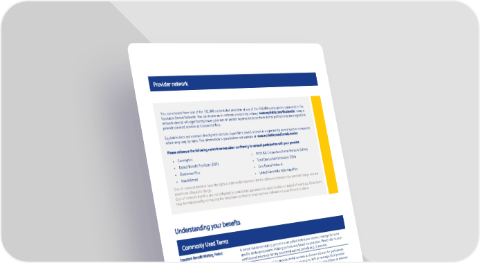 Page 10 Provider network You can choose from one of the 132,000 credentialed providers at any of the 600,000 access points nationwide in the Equitable Dental Network. You can locate an in-network provider by visiting: . Using a www.equitable.com/finddentist network dentist will significantly lower your out-of-pocket expense because these dental professionals have agreed to provide covered services at discounted fees. Equitable does not contract directly with dentists. Equitable’s dental network is supported by several partner companies which may vary by state. This information is provided on our website at . www.equitable.com/dentalprovider Please reference the following network names when confirming in-network participation with your provider. • Careington • Dental Benefit Providers (DBP) • Dentemax Plus • HealthSmart • PPO USA Connection Dental Network (GEHA) • Total Dental Administrators (TDA) • Zelis Dental Network • United Concordia AdvantagePlus Out-of-network dentists have the right to balance bill members for the difference between the provider charge and our maximum allowable charge. Out-of-network dentists are not obligated by contractual agreement to submit claims on behalf of members. Claim forms may be requested by contacting the telephone number or email address indicated on your ID card or above. Understanding your benefits Commonly Used Terms Standard Benefit Waiting Period A dental insurance waiting period is a set period before you receive coverage for some specific dental procedures. Waiting periods vary based on your plan. Please refer to your certificate of insurance for any associated waiting periods (e.g., 6 months). In-Network Provider Dentists who have agreed to provide dental services at discounted rates for participants. Because your plan has a Passive PPO ,you can save up to 34% on average off of provider change by visiting an in network provider. You will not be liable for the difference between the discounted rate and the provider charge if you visit an in-network provider. Out-of-Network Provider Dentists who have not agreed to provide dental services at discounted rates for participants. You are free to visit out-of-network providers, but you may be balance billed for the difference between our allowed amount and the provider charge. Annual Individual Maximum Annual maximum for each individual covered under the plan for procedures other than orthodontia. Lifetime Orthodontia Maximum Maximum for orthodontia procedures which pays up to the maximum over a lifetime including treatment covered under other dental plans. Frequently Asked Questions When can I enroll? You can enroll when you are initially eligible for benefits and during any subsequent annual enrollment period defined by your employer or if there is a life status change, such as involuntary termination under another policy. • • • • • • • •