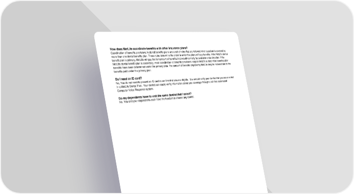 DN-GCERT-GOLD GCERT Voluntary Dental Benefit Summary 200 Park Ave., New York, NY 10166 © 2024 MetLife Services and Solutions, LLC L0623032885[exp0625][xNM] How does MetLife coordinate benefits with other insurance plans? Coordination of benefits provisions in dental benefits plans are a set of rules that are followed when a patient is covered by more than one dental benefits plan. These rules determine the order in which the plans will pay benefits. If the MetLife dental benefit plan is primary, MetLife will pay the full amount of benefits that would normally be available under the plan. If the MetLife dental benefit plan is secondary, most coordination of benefits provisions require MetLife to determine benefits after benefits have been determined under the primary plan. The amount of benefits payable by MetLife may be reduced due to the benefits paid under the primary plan. Do I need an ID card? No, You do not need to present an ID card to confirm that you are eligible. You should notify your dentist that you are enrolled in a MetLife Dental Plan. Your dentist can easily verify information about your coverage through a toll-free automated Computer Voice Response system. Do my dependents have to visit the same dentist that I select? No. You and your dependents each have the freedom to choose any dentist.