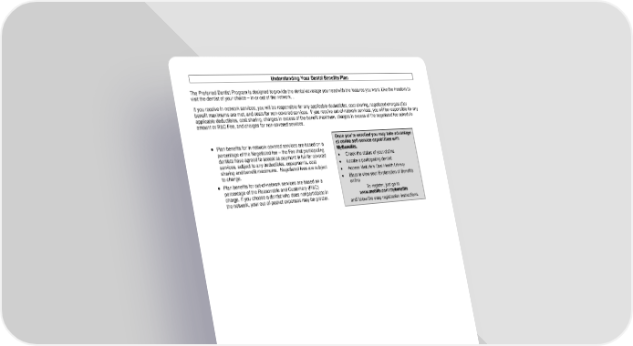 DN-GCERT-GOLD GCERT Voluntary Dental Benefit Summary 200 Park Ave., New York, NY 10166 © 2024 MetLife Services and Solutions, LLC L0623032885[exp0625][xNM] Understanding Your Dental Benefits Plan The Preferred Dentist Program is designed to provide the dental coverage you need with the features you want. Like the freedom to visit the dentist of your choice – in or out of the network. . If you receive in-network services, you will be responsible for any applicable deductibles, cost sharing, negotiated charges after benefit maximums are met, and costs for non-covered services. If you receive out-of-network services, you will be responsible for any applicable deductibles, cost sharing, charges in excess of the benefit maximum, charges in excess of the negotiated fee schedule amount or R&C Fee, and charges for non-covered services. • Plan benefits for in-network covered services are based on a percentage of the Negotiated fee – the Fee that participating dentists have agreed to accept as payment in full for covered services, subject to any deductibles, copayments, cost sharing and benefit maximums. Negotiated fees are subject to change. • Plan benefits for out-of-network services are based on a percentage of the Reasonable and Customary (R&C) charge. If you choose a dentist who does not participate in the network, your out-of-pocket expenses may be greater. Once you’re enrolled you may take advantage of online self-service capabilities with MyBenefits. • Check the status of your claims • Locate a participating dentist • Access MetLife’s Oral Health Library • Elect to view your Explanation of Benefits online To register, just go to www.metlife.com/mybenefits and follow the easy registration instructions.