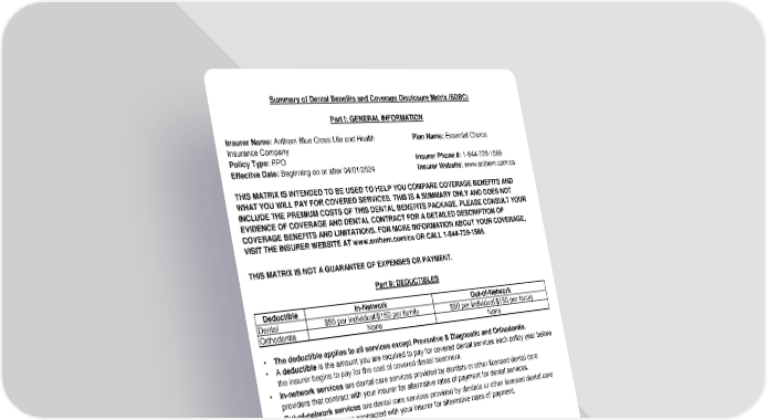 Summary of Dental Benefits and Coverage Disclosure Matrix (SDBC) Part I: GENERAL INFORMATION Insurer Name: Anthem Blue Cross Life and Health Plan Name: Essential Choice Insurance Company Policy Type: PPO Insurer Phone #: 1-844-729-1565 Effective Date: Beginning on or after 04/01/2024 Insurer Website: www.anthem.com/ca THIS MATRIX IS INTENDED TO BE USED TO HELP YOU COMPARE COVERAGE BENEFITS AND WHAT YOU WILL PAY FOR COVERED SERVICES. THIS IS A SUMMARY ONLY AND DOES NOT INCLUDE THE PREMIUM COSTS OF THIS DENTAL BENEFITS PACKAGE. PLEASE CONSULT YOUR EVIDENCE OF COVERAGE AND DENTAL CONTRACT FOR A DETAILED DESCRIPTION OF COVERAGE BENEFITS AND LIMITATIONS. FOR MORE INFORMATION ABOUT YOUR COVERAGE, VISIT THE INSURER WEBSITE AT www.anthem.com/ca OR CALL 1-844-729-1565. THIS MATRIX IS NOT A GUARANTEE OF EXPENSES OR PAYMENT. Part II: DEDUCTIBLES Deductible In-Network Out-of-Network Dental $50 per individual/$150 per family $50 per individual/$150 per family Orthodontia None None • The deductible applies to all services except Preventive & Diagnostic and Orthodontia. • A deductible is the amount you are required to pay for covered dental services each policy year before the insurer begins to pay for the cost of covered dental treatment. • In-network services are dental care services provided by dentists or other licensed dental care providers that contract with your insurer for alternative rates of payment for dental services. • Out-of-network services are dental care services provided by dentists or other licensed dental care providers that have not contracted with your insurer for alternative rates of payment.
