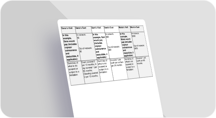 Dana’s Visit Dana's Cost Sam's Visit Sam's Cost Maria's Visit Maria's Cost In this In-network: In this In-network: In this In-network: example, $0 example, Sam $60 example, $550 Dana would would pay Maria would pay (includes (includes pay (includes copays/ Out-of-network: copays/ Out-of-network: copays/ Out-of-network: coinsurance $0 coinsurance $80 coinsurance $900 and and and deductible, if deductible, if deductible, if applicable): applicable): applicable): Summary of Exam covered 2 Summary of Covered 1 per Summary of Covered 1 per what is not per 12 months; X- what is not tooth per surface what is not tooth per 60 covered or ray covered 1 per covered or per 24 months covered or months subject to a 60 months; subject to a subject to a limitation: Cleaning covered limitation: limitation: 2 per 12 months;