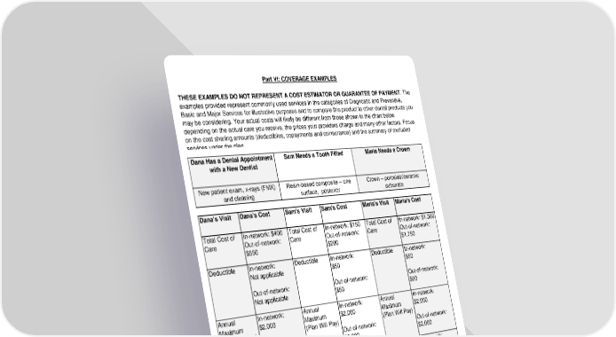 Part VI: COVERAGE EXAMPLES THESE EXAMPLES DO NOT REPRESENT A COST ESTIMATOR OR GUARANTEE OF PAYMENT. The examples provided represent commonly used services in the categories of Diagnostic and Preventive, Basic and Major Services for illustrative purposes and to compare this product to other dental products you may be considering. Your actual costs will likely be different from those shown in the chart below depending on the actual care you receive, the prices your providers charge and many other factors. Focus on the cost sharing amounts (deductibles, copayments and coinsurance) and the summary of excluded services under the plan. Dana Has a Dental Appointment Sam Needs a Tooth Filled Maria Needs a Crown with a New Dentist New patient exam, x-rays (FMX) Resin-based composite – one Crown – porcelain/ceramic and cleaning surface, posterior substrate Dana’s Visit Dana's Cost Sam's Visit Sam's Cost Maria's Visit Maria's Cost Total Cost of In-network: $400 Total Cost of In-network: $150 Total Cost of In-network: $1,300 Care Out-of-network: Care Out-of-network: Care Out-of-network: $550 $200 $1,750 Deductible In-network: Deductible In-network: Deductible In-network: Not applicable $50 $50 Out-of-network: Out-of-network: Out-of-network: Not applicable $50 $50 Annual In-network: Annual In-network: Annual In-network: Maximum $2,000 Maximum $2,000 Maximum $2,000 (Plan Will Pay) (Plan Will Pay) (Plan Will Pay) Out-of-network: Out-of-network: Out-of-network: $2,000 $2,000 $2,000 Patient Cost In-network: Patient Cost In-network: Patient Cost In-network: (copayment or 0% (copayment or 10% (copayment or 40% coinsurance) coinsurance) coinsurance) Out-of-network: Out-of-network: Out-of-network: 0% 20% 50%