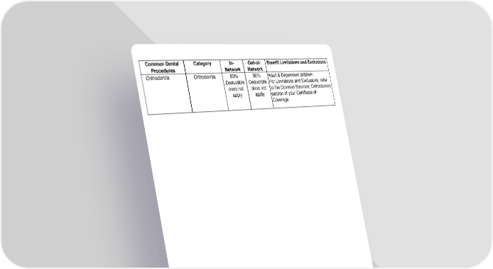 Common Dental Category In- Out-of- Benefit Limitations and Exclusions Procedures Network Network Orthodontia Orthodontia 50% 50% Adult & Dependent children: Deductible Deductible For Limitations and Exclusions, refer does not does not to the Covered Services; Orthodontics apply apply section of your Certificate of Coverage.