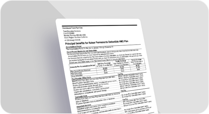Disclosure Form Part One Total Education Solutions Cust ID 233882 Member Services 800 464-4000 Home Region: Southern California 4/1/25 through 3/31/26 Principal benefits for Kaiser Permanente Deductible HMO Plan Accumulation Period The Accumulation Period for this plan is January 1 through December 31. Out-of-Pocket Maximums and Deductibles For Services that apply to the Plan Out-of-Pocket Maximum, you will not pay any more Cost Share for the rest of the Accumulation Period once you have reached the amounts listed below. For Services that are subject to the Plan Deductible or the Drug Deductible, you must pay Charges for covered Services you receive during the Accumulation Period until you reach the deductible amounts listed below. All payments you make toward your deductibles apply to the Plan Out-of-Pocket Maximum amounts listed below. Self-Only Coverage Family Coverage Family Coverage Amounts Per Accumulation Period (a Family of one Member) Each Member in a Family Entire Family of two or of two or more Members more Members Plan Out-of-Pocket Maximum $3,000 $3,000 $6,000 Plan Deductible $750 $750 $1,500 Drug Deductible None None None Plan Provider Office Visits You Pay Most Primary Care Visits and most Non-Physician Specialist Visits ...... $30 per visit (Plan Deductible doesn’t apply) Most Physician Specialist Visits ............................................................. $40 per visit (Plan Deductible doesn’t apply) Routine physical maintenance exams, including well-woman exams .... No charge (Plan Deductible doesn’t apply) Well-child preventive exams (through age 23 months) .......................... No charge (Plan Deductible doesn’t apply) Routine eye exams with a Plan Optometrist .......................................... No charge (Plan Deductible doesn’t apply) Urgent care consultations, evaluations, and treatment .......................... $30 per visit (Plan Deductible doesn’t apply) Most physical, occupational, and speech therapy .................................. $30 per visit (Plan Deductible doesn’t apply) Telehealth Visits You Pay Primary Care Visits and Non-Physician Specialist Visits by interactive video or telephone .................................................................................. No charge (Plan Deductible doesn’t apply) Physician Specialist Visits by interactive video or telephone ................. No charge (Plan Deductible doesn’t apply) Outpatient Services You Pay Outpatient surgery and certain other outpatient procedures .................. 20% Coinsurance after Plan Deductible Most immunizations (including the vaccine) ........................................... No charge (Plan Deductible doesn’t apply) Most X-rays and laboratory tests ............................................................ $10 per encounter (Plan Deductible doesn’t apply) Preventive X-rays, screenings, and laboratory tests as described in the EOC ................................................................................................ No charge (Plan Deductible doesn’t apply) MRI, most CT, and PET scans ............................................................... 20% Coinsurance up to a maximum of $150 per procedure (Plan Deductible doesn’t apply) Hospital Inpatient Services You Pay Room and board, surgery, anesthesia, X-rays, laboratory tests, and drugs ..................................................................................................... 20% Coinsurance after Plan Deductible Emergency Services You Pay Emergency department visits ................................................................. 20% Coinsurance after Plan Deductible Note: If you are admitted directly to the hospital as an inpatient for covered Services, you will pay the inpatient Cost Share instead of the emergency department Cost Share (see “Hospital Inpatient Services” for inpatient Cost Share) Ambulance Services You Pay Ambulance Services ............................................................................... $150 per trip (Plan Deductible doesn’t apply) Prescription Drug Coverage You Pay Covered outpatient items in accord with our drug formulary guidelines: Most generic items (Tier 1) at a Plan Pharmacy ................................. $10 for up to a 30-day supply (Plan Deductible doesn’t apply) Most generic (Tier 1) refills through our mail-order service ................. $20 for up to a 100-day supply (Plan Deductible doesn’t apply) (continues)