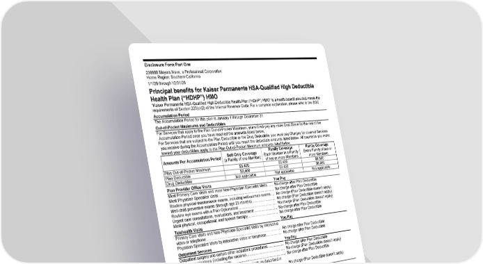 Disclosure Form Part One (continues) 236688 Meyers Nave, a Professional Corporation Home Region: Southern California 1/1/26 through 12/31/26 Principal benefits for Kaiser Permanente HSA-Qualified High Deductible Health Plan (“HDHP”) HMO “Kaiser Permanente HSA-Qualified High Deductible Health Plan (“HDHP”) HMO” is a health benefit plan that meets the requirements of Section 223(c)(2) of the Internal Revenue Code. For a complete explanation, please refer to the EOC. Accumulation Period The Accumulation Period for this plan is January 1 through December 31. Out-of-Pocket Maximums and Deductibles For Services that apply to the Plan Out-of-Pocket Maximum, you will not pay any more Cost Share for the rest of the Accumulation Period once you have reached the amounts listed below. For Services that are subject to the Plan Deductible or the Drug Deductible, you must pay Charges for covered Services you receive during the Accumulation Period until you reach the deductible amounts listed below. All payments you make toward your deductibles apply to the Plan Out-of-Pocket Maximum amounts listed below. Amounts Per Accumulation Period Self-Only Coverage (a Family of one Member) Family Coverage Each Member in a Family of two or more Members Family Coverage Entire Family of two or more Members Plan Out-of-Pocket Maximum $3,400 $3,400 $6,800 Plan Deductible $3,400 $3,400 $6,800 Drug Deductible Not applicable Not applicable Not applicable Plan Provider Office Visits You Pay Most Primary Care Visits and most Non-Physician Specialist Visits ...... No charge after Plan Deductible Most Physician Specialist Visits ............................................................. No charge after Plan Deductible Routine physical maintenance exams, including well-woman exams .... No charge (Plan Deductible doesn’t apply) Well-child preventive exams (through age 23 months) .......................... No charge (Plan Deductible doesn’t apply) Routine eye exams with a Plan Optometrist .......................................... No charge (Plan Deductible doesn’t apply) Urgent care consultations, evaluations, and treatment .......................... No charge after Plan Deductible Most physical, occupational, and speech therapy .................................. No charge after Plan Deductible Telehealth Visits You Pay Primary Care Visits and Non-Physician Specialist Visits by interactive video or telephone .................................................................................. No charge after Plan Deductible Physician Specialist Visits by interactive video or telephone ................. No charge after Plan Deductible Outpatient Services You Pay Outpatient surgery and certain other outpatient procedures .................. No charge after Plan Deductible Most immunizations (including the vaccine) ........................................... No charge (Plan Deductible doesn’t apply) Most X-rays and laboratory tests ............................................................ No charge after Plan Deductible Preventive X-rays, screenings, and laboratory tests as described in the EOC ................................................................................................ No charge (Plan Deductible doesn’t apply) Hospital Inpatient Services You Pay Room and board, surgery, anesthesia, X-rays, laboratory tests, and drugs ..................................................................................................... No charge after Plan Deductible Emergency Services and Care You Pay Emergency department visits ................................................................. No charge after Plan Deductible Note: If you are admitted directly to the hospital as an inpatient for covered Services, you will pay the inpatient Cost Share instead of the emergency department Cost Share (see “Hospital Inpatient Services” for inpatient Cost Share) Ambulance Services You Pay Ambulance Services ............................................................................... No charge after Plan Deductible Prescription Drug Coverage You Pay Covered outpatient items in accord with our drug formulary guidelines: Most generic items (Tier 1) at a Plan Pharmacy or through our mail- order service ....................................................................................... No charge for up to a 100-day supply after Plan Deductible Most brand-name items (Tier 2) at a Plan Pharmacy or through our mail-order service ............................................................................... No charge for up to a 100-day supply after Plan Deductible Most specialty items (Tier 4) at a Plan Pharmacy ............................... No charge for up to a 30-day supply after Plan Deductible