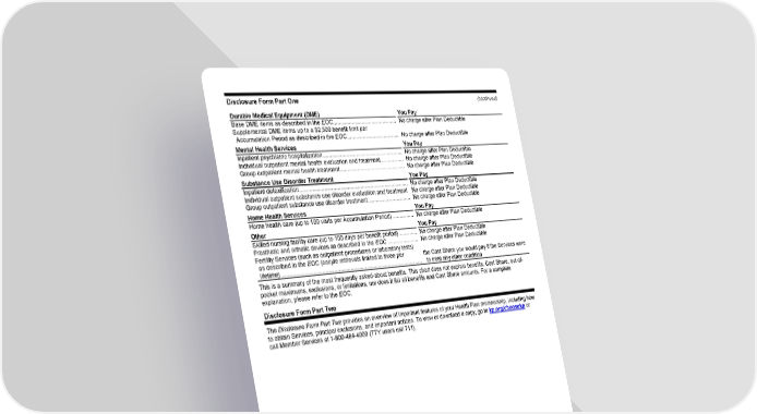 Disclosure Form Part One (continued) 4215216.3.2.S000796606 embedded Durable Medical Equipment (DME) You Pay Base DME items as described in the EOC ............................................. No charge after Plan Deductible Supplemental DME items up to a $2,500 benefit limit per Accumulation Period as described in the EOC ..................................... No charge after Plan Deductible Mental Health Services You Pay Inpatient psychiatric hospitalization ........................................................ No charge after Plan Deductible Individual outpatient mental health evaluation and treatment ................ No charge after Plan Deductible Group outpatient mental health treatment .............................................. No charge after Plan Deductible Substance Use Disorder Treatment You Pay Inpatient detoxification ............................................................................ No charge after Plan Deductible Individual outpatient substance use disorder evaluation and treatment No charge after Plan Deductible Group outpatient substance use disorder treatment .............................. No charge after Plan Deductible Home Health Services You Pay Home health care (up to 100 visits per Accumulation Period) ............... No charge after Plan Deductible Other You Pay Skilled nursing facility care (up to 100 days per benefit period) ............. No charge after Plan Deductible Prosthetic and orthotic devices as described in the EOC ...................... No charge after Plan Deductible Fertility Services (such as outpatient procedures or laboratory tests) as described in the EOC (oocyte retrievals limited to three per lifetime) ................................................................................................. the Cost Share you would pay if the Services were to treat any other condition This is a summary of the most frequently asked-about benefits. This chart does not explain benefits, Cost Share, out-of- pocket maximums, exclusions, or limitations, nor does it list all benefits and Cost Share amounts. For a complete explanation, please refer to the EOC. Disclosure Form Part Two The Disclosure Form Part Two provides an overview of important features of your Health Plan membership, including how to obtain Services, principal exclusions, and important notices. To view or download a copy, go to kp.org/choosekp or call Member Services at 1-800-464-4000 (TTY users call 711).
