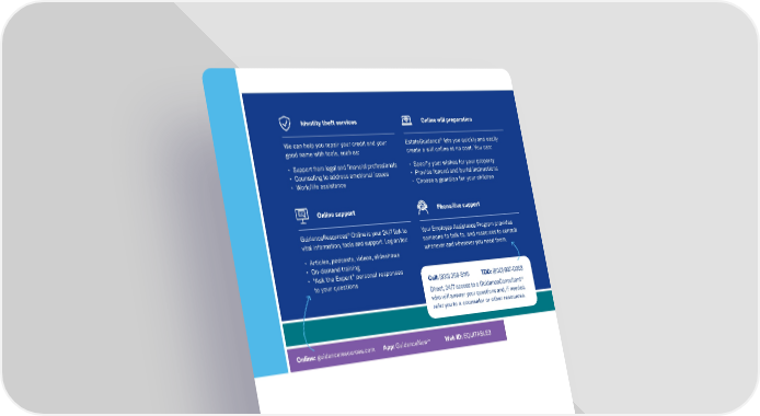 Employee Assistance Program (EAP) work/life services, which are provided by ComPsych® Corporation, are not insurance, and the charge is segregated from the insurance cost, but included in the total amount billed. ComPsych®, GuidanceResources® and EstateGuidance® are registered trademarks and service marks of ComPsych® Corporation. EAP By DesignSM is not a service provided in partnership with ComPsych® Corporation. ComPsych® is not affiliated with Equitable, and services they provide are separate and apart from the insurance provided by Equitable. Equitable is the brand name of the retirement and protection subsidiaries of Equitable Holdings, Inc., including Equitable Financial Life Insurance Company (Equitable Financial) (NY, NY); Equitable Financial Life Insurance Company of America (Equitable America), an AZ stock company with an administrative office located in Charlotte, NC; and Equitable Distributors, LLC. Equitable Advisors is the brand name of Equitable Advisors, LLC (member FINRA, SIPC) (Equitable Financial Advisors in MI & TN). All group insurance products are issued either by Equitable Financial or Equitable America, which have sole responsibility for their respective insurance and are backed solely by their claims-paying obligations. Some products are not available in all states. Identity theft services Online will preparation We can help you repair your credit and your good name with tools, such as: • Support from legal and financial professionals • Counseling to address emotional issues • Work/life assistance EstateGuidance® lets you quickly and easily create a will online at no cost. You can: • Specify your wishes for your property • Provide funeral and burial instructions • Choose a guardian for your children Online support Phone/live support GuidanceResources® Online is your 24/7 link to vital information, tools and support. Log on for: • Articles, podcasts, videos, slideshows • On-demand training • “Ask the Expert” personal responses to your questions Your Employee Assistance Program provides someone to talk to, and resources to consult whenever and wherever you need them. Call: (833) 256-5115 TDD: (800) 697-0353 Direct, 24/7 access to a GuidanceConsultant sm who will answer your questions and, if needed, refer you to a counselor or other resources. Online: guidanceresources.com App: GuidanceNow sm Web ID: EQUITABLE3 © 2024 Equitable Holdings, Inc. All rights reserved. GE- 6626491.1 (5/24) (Exp. 5/26) | G2580019 | Cat. #160279 (5/24)