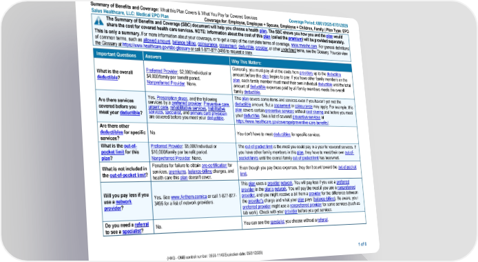 Summary of Benefits and Coverage: What this Plan Covers & What You Pay for Covered Services Coverage Period: 08/01/2025-07/31/2026 Salus Healthcare, LLC: Medical EPO Plan Coverage for: Employee, Employee + Spouse, Employee + Children, Family | Plan Type: EPO (HHS - OMB control number: 0938-1146/Expiration date: 05/31/2026) 1 of 8 The Summary of Benefits and Coverage (SBC) document will help you choose a health plan. The SBC shows you how you and the plan would share the cost for covered health care services. NOTE: Information about the cost of this plan (called the premium) will be provided separately. This is only a summary. For more information about your coverage, or to get a copy of the complete terms of coverage, www.myevhc.com. For general definitions of common terms, such as allowed amount, balance billing, coinsurance, copayment, deductible, provider, or other underlined terms, see the Glossary. You can view the Glossary at https://www.healthcare.gov/sbc-glossary or call 1-877-877-3496 to request a copy. Important Questions Answers Why This Matters: What is the overall deductible? Preferred Provider: $2,000/individual or $4,000/family per benefit period. Nonpreferred Provider: None. Generally, you must pay all of the costs from providers up to the deductible amount before this plan begins to pay. If you have other family members on the plan, each family member must meet their own individual deductible until the total amount of deductible expenses paid by all family members meets the overall family deductible. Are there services covered before you meet your deductible? Yes. Prescription drugs, and the following services by a preferred provider: Preventive care, urgent care, rehabilitative services, habilitative services, specialist, and primary care physician are covered before you meet your deductible. This plan covers some items and services even if you haven’t yet met the deductible amount. But a copayment or coinsurance may apply. For example, this plan covers certain preventive services without cost sharing and before you meet your deductible. See a list of covered preventive services at https://www.healthcare.gov/coverage/preventive-care-benefits/. Are there other deductibles for specific services? No. You don't have to meet deductibles for specific services. What is the out-of- pocket limit for this plan? Preferred Provider: $5,000/individual or $10,000/family per benefit period. Nonpreferred Provider: None. The out-of-pocket limit is the most you could pay in a year for covered services. If you have other family members in this plan, they have to meet their own out-of- pocket limits until the overall family out-of-pocket limit has been met. What is not included in the out-of-pocket limit? Penalties for failure to obtain pre-certification for services, premiums, balance-billing charges, and health care this plan doesn't cover. Even though you pay these expenses, they don’t count toward the out-of-pocket limit. Will you pay less if you use a network provider? Yes. See www.Anthem.com/ca or call 1-877-877- 3496 for a list of network providers. This plan uses a provider network. You will pay less if you use a preferred provider in the plan’s network. You will pay the most if you use a nonpreferred provider, and you might receive a bill from a provider for the difference between the provider's charge and what your plan pays (balance-billing). Be aware, your preferred provider might use a nonpreferred provider for some services (such as lab work). Check with your provider before you get services. Do you need a referral to see a specialist? No. You can see the specialist you choose without a referral.