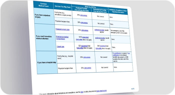 * For more information about limitations and exceptions, see the plan or policy document at www.myevhc.com. 4 of 8 Common Medical Event Services You May Need What You Will Pay Limitations, Exceptions, & Other Important Information Preferred Provider (You will pay the least) Nonpreferred Provider (You will pay the most) If you have outpatient surgery Facility fee (e.g., ambulatory surgery center) 30% coinsurance Not covered None. Physician/surgeon fees 30% coinsurance Not covered None. If you need immediate medical attention Emergency room care 30% coinsurance preferred provider benefit applies Non-emergency use of the emergency room is not covered. Emergency medical transportation $150 copayment (deductible does not apply) preferred provider benefit applies None. Urgent care $25 copayment/visit (deductible does not apply) $50 copayment/visit (deductible does not apply) None. If you have a hospital stay Facility fee (e.g., hospital room) 30% coinsurance Not covered Pre-certification is required. If pre- certification is not obtained, benefits are subject to a $300 penalty of the total cost of the service. Physician/surgeon fees 30% coinsurance Not covered None.