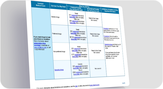 * For more information about limitations and exceptions, see the plan or policy document at www.myevhc.com. 3 of 8 Common Medical Event Services You May Need What You Will Pay Limitations, Exceptions, & Other Important Information Preferred Provider (You will pay the least) Nonpreferred Provider (You will pay the most) If you need drugs to treat your illness or condition More information about prescription drug coverage is available at www.carelonrx.com or call 1-833-419-0530 Generic drugs Retail: $10 copayment/prescription (deductible does not apply) Mail order: $25 copayment/prescription (deductible does not apply) Retail & Mail Order: Not covered Copayment applies to a 31 day supply Retail or 32-90 day supply Mail-Order prescription. Copayment does not apply to preventive drugs required by the Affordable Care Act. Specialty drugs are limited to a 31 day supply for Retail or Mail Order. If you purchase a brand name drug when a generic drug is available, you must pay difference in cost. Preferred drugs Retail: $35 copayment/prescription (deductible does not apply) Mail order: $87.50 copayment/prescription (deductible does not apply) Retail & Mail Order: Not covered Non-preferred drugs Retail: $70 copayment/prescription (deductible does not apply) Mail order: $175 copayment/prescription (deductible does not apply) Retail & Mail Order: Not covered Specialty drugs Generic: $75 copayment/prescription (deductible does not apply) Brand: $250 copayment/prescription (deductible does not apply) Not covered