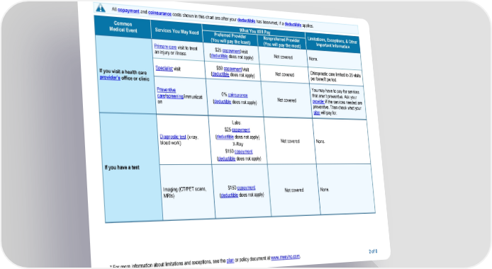 * For more information about limitations and exceptions, see the plan or policy document at www.myevhc.com. 2 of 8 All copayment and coinsurance costs shown in this chart are after your deductible has been met, if a deductible applies. Common Medical Event Services You May Need What You Will Pay Limitations, Exceptions, & Other Important Information Preferred Provider (You will pay the least) Nonpreferred Provider (You will pay the most) If you visit a health care provider’s office or clinic Primary care visit to treat an injury or illness $25 copayment/visit (deductible does not apply) Not covered None. Specialist visit $50 copayment/visit (deductible does not apply) Not covered Chiropractic care limited to 20 visits per benefit period. Preventive care/screening/immunizati on 0% coinsurance (deductible does not apply) Not covered You may have to pay for services that aren’t preventive. Ask your provider if the services needed are preventive. Then check what your plan will pay for. If you have a test Diagnostic test (x-ray, blood work) Labs: $25 copayment (deductible does not apply) X-Ray: $150 copayment (deductible does not apply) Not covered None. Imaging (CT/PET scans, MRIs) $150 copayment (deductible does not apply) Not covered None.