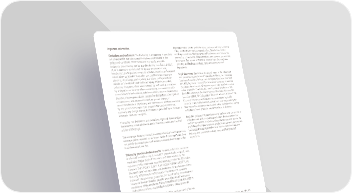 Page 5 Important Information The following is a summary. A complete Limitations and exclusions: list of applicable exclusions and limitations are included in the policy and certificate. State variations may apply. Hospital Indemnity benefits may not be payable for any loss that is a result of, or is caused or contributed to by: war or any act of war, intoxication, participation in certain activities involving an increased risk of injury as listed in the policy and certificate (ex: mountain climbing, sky diving), participating in a felony or illegal activity, suicide or intentionally self-inflicted injury, while incarcerated, voluntary drug use unless administered by and used as instructed by a physician or for over-the-counter drugs in accordance with manufacturer's instructions, substance abuse, any mental/nervous disorder, elective procedures (except for sterilization, tubal ligation or vasectomy, and reversal thereof, or gender change, if recommended by a physician), and treatment or services provided by any government agency or program for which there is not normally any charge except for treatment provided by or through a Veteran's Home or Hospital. The policy has limitations and exclusions. Optional riders and/or features may incur additional costs. Plan documents are the final arbiter of coverage. This coverage does not constitute comprehensive health insurance coverage (often referred to as "major medical coverage") and does not satisfy the requirement of minimum essential coverage under the Affordable Care Act. Hospital indemnity insurance This policy provides limited benefits: is a limited benefit policy. It does NOT provide basic hospital, basic medical or major medical insurance, and does not satisfy the requirement for minimum essential coverage under the Affordable Care Act. THIS POLICY IS NOT A MEDICARE SUPPLEMENT PLAN. The certificate has exclusions and limitations for certain conditions that may affect any benefits payable. For costs and complete details of the coverage, please see the actual policy or contact your insurance broker. Benefits payable are subject to all terms and conditions of the certificate. Policy form MOEBP22 HI; AXEBP22 HI and state variations. Availability is subject to state approvals. Hospital does not include certain facilities such as nursing homes, convalescent care, or extended care facilities. Equitable policy strictly prohibits doing business with any person or entity involved with marijuana production, distribution or other ancillary operations. Marijuana-related businesses also include the marketing of marijuana-related products and services, persons and businesses that service and receive income from the marijuana industry, and business involving hemp and hemp-related ingredients. Equitable is the brand name of the retirement Legal disclosures: and protection subsidiaries of Equitable Holdings, Inc., including Equitable Financial Life Insurance Company (Equitable Financial) (NY, NY), Equitable Financial Life Insurance Company of America (Equitable America), an AZ stock company with an administrative office located in Charlotte, NC, and Equitable Distributors, LLC. Equitable Advisors is the brand name of Equitable Advisors, LLC (member FINRA, SIPC) (Equitable Financial Advisors in MI and TN). All group insurance products are issued either by Equitable Financial or Equitable America, which have sole responsibility for their respective insurance and backed solely by their claims-paying obligations. Some products are not available in all states. Equitable policy strictly prohibits doing business with any person or entity involved with marijuana production, distribution or other ancillary operations. Marijuana related businesses also include the marketing of marijuana related products and services, persons and businesses that service and receive income from the marijuana industry, and business involving hemp and hemp related ingredients. ©2023 Equitable Holdings, Inc. All rights reserved. (6/23) | EB360® is a registered mark of Equitable Holdings, Inc., NY, NY.