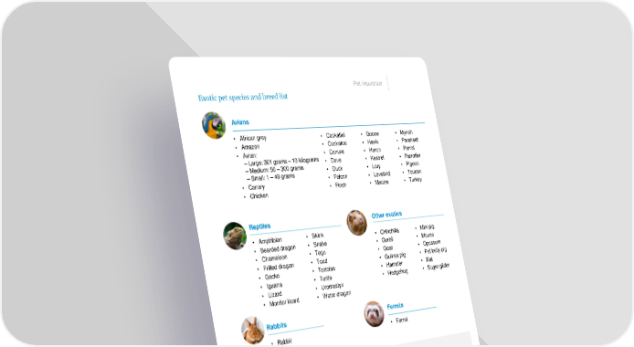 Pet Insurance Exotic pet species and breed list Avians • African grey • Cockatiel • Goose • Mynah • Amazon • Cockatoo • Hawk • Parakeet • Avian: • Conure • Heron • Parrot – Large: 301 grams – 10 kilograms • Dove • Kestrel • Parrotlet – Medium: 50 – 300 grams • Duck • Lory • Pigeon – Small: 1 – 49 grams • Falcon • Lovebird • Toucan • Canary • Finch • Macaw • Turkey • Chicken Reptiles Other exotics • Amphibian • Skink • Chinchilla • Mini pig • Bearded dragon • Snake • Gerbil • Mouse • Chameleon • Tegu • Goat • Opossum • Frilled dragon • Toad • Guinea pig • Pot belly pig • Gecko • Tortoise • Hamster • Rat • Iguana • Turtle • Hedgehog • Sugar glider • Lizard • Uromastyx • Monitor lizard • Water dragon Rabbits Ferrets • Rabbit • Ferret Get a quote or enroll today. Call 1-800-GET-MET8 (1-800-438-6388) 1. May not be available in all states. 2. Reimbursement options include: 50%, 70%, 80% and 90%. Pet age restrictions may apply. 3. When using multiple discounts, discounts cannot exceed 30%. Each discount may not be available in all states. Please contact MetLife Pet for further details. 4. Your pet’s deductible automatically decreases by $50 each policy year that you don’t receive a claim reimbursement. Coverage issued by Metropolitan General Insurance Company (“MetGen”), a Rhode Island insurance company headquartered at 700 Quaker Lane, Warwick, RI 02886. Availability is subject to regulatory approval. Coverage subject to restrictions, exclusions and limitations and application is subject to underwriting. See policy or contact MetLife Pet Insurance Solutions LLC (“MetLife Pet”) for details. MetLife Pet is the policy administrator. It may operate under an alternate or fictitious name in certain jurisdictions, including MetLife Pet Insurance Services LLC (New York and Minnesota) and MetLife Pet Insurance Solutions Agency LLC (Illinois). L1223037177[exp1225][All States][DC] © 2023 MetLife Services and Solutions, LLC, New York, NY 10166. All Rights Reserved © 2023 Peanuts Worldwide LLC