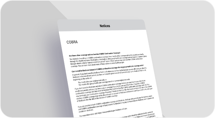Are there other coverage options besides COBRA Continuation Coverage? Yes. Instead of enrolling in COBRA continuation coverage, there may be other coverage options for you and your family through the Health Insurance Marketplace, Medicaid, or other group health plan coverage options (such as a spouse’s plan) through what is called a “special enrollment period.” Some of these options may cost less than COBRA continuation coverage. You can learn more about many of these options at www.healthcare.gov. Can I enroll in Medicare instead of COBRA continuation coverage after my group health plan coverage ends? In general, if you don’t enroll in Medicare Part A or B when you are first eligible because you are still employed, after the Medicare initial enrollment period, you have an 8-month special enrollment period to sign up for Medicare Part A or B, beginning on the earlier of The month after your employment ends; or The month after group health plan coverage based on current employment ends. If you don’t enroll in Medicare and elect COBRA continuation coverage instead, you may have to pay a Part B late enrollment penalty and you may have a gap in coverage if you decide you want Part B later. If you elect COBRA continuation coverage and later enroll in Medicare Part A or B before the COBRA continuation coverage ends, the Plan may terminate your continuation coverage. However, if Medicare Part A or Bis effective on or before the date of the COBRA election, COBRA coverage may not be discontinued on account of Medicare entitlement, even if you enroll in the other part of Medicare after the date of the election of COBRA coverage. If you are enrolled in both COBRA continuation coverage and Medicare, Medicare will generally pay first (primary payer) and COBRA continuation coverage will pay second. Certain plans may pay as if secondary to Medicare, even if you are not enrolled in Medicare. For more information visit https://www.medicare.gov/medicare-and-you. If you have questions: Questions concerning your Plan or your COBRA continuation coverage rights should be addressed to the contact or contacts identified below. For more information about your rights under the Employee Retirement Income Security Act (ERISA), including COBRA, the Patient Protection and Affordable Care Act, and other laws affecting group health plans, contact the nearest Regional or District Office of the U.S. Department of Labor’s Employee Benefits Security Administration (EBSA) in your area or visit www.dol.gov/agencies/ebsa. (Addresses and phone numbers of Regional and District EBSA Offices are available through EBSA’s website.) For more information about the Marketplace, visit www.healthcare.gov. Keep your Plan informed of address changes. To protect your family’s rights, let the Plan Administrator know about any changes in the addresses of family members. You should also keep a copy, for your records, of any notices you send to the Plan Administrator. COBRA Notices 4