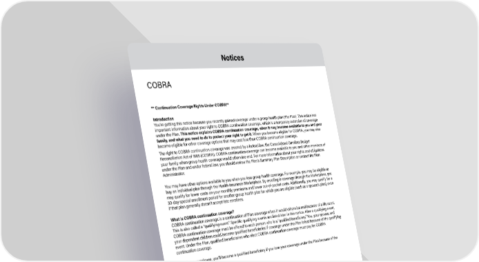 ** Continuation Coverage Rights Under COBRA** Introduction You’re getting this notice because you recently gained coverage under a group health plan (the Plan). This notice has important information about your right to COBRA continuation coverage, which is a temporary extension of coverage under the Plan. This notice explains COBRA continuation coverage, when it may become available to you and your family, and what you need to do to protect your right to get it. When you become eligible for COBRA, you may also become eligible for other coverage options that may cost less than COBRA continuation coverage. The right to COBRA continuation coverage was created by a federal law, the Consolidated Omnibus Budget Reconciliation Act of 1985 (COBRA). COBRA continuation coverage can become available to you and other members of your family when group health coverage would otherwise end. For more information about your rights and obligations under the Plan and under federal law, you should review the Plan’s Summary Plan Description or contact the Plan Administrator. You may have other options available to you when you lose group health coverage. For example, you may be eligible to buy an individual plan through the Health Insurance Marketplace. By enrolling in coverage through the Marketplace, you may qualify for lower costs on your monthly premiums and lower out-of-pocket costs. Additionally, you may qualify for a 30-day special enrollment period for another group health plan for which you are eligible (such as a spouse’s plan), even if that plan generally doesn’t accept late enrollees. What is COBRA continuation coverage? COBRA continuation coverage is a continuation of Plan coverage when it would otherwise end because of a life event. This is also called a “qualifying event.” Specific qualifying events are listed later in this notice. After a qualifying event, COBRA continuation coverage must be offered to each person who is a “qualified beneficiary.” You, your spouse, and your dependent children could become qualified beneficiaries if coverage under the Plan is lost because of the qualifying event. Under the Plan, qualified beneficiaries who elect COBRA continuation coverage must pay for COBRA continuation coverage. If you’re an employee, you’ll become a qualified beneficiary if you lose your coverage under the Plan because of the following qualifying events: Your hours of employment are reduced, or Your employment ends for any reason other than your gross misconduct. If you’re the spouse of an employee, you’ll become a qualified beneficiary if you lose your coverage under the Plan because of the following qualifying events: Your spouse dies; Your spouse’s hours of employment are reduced; Your spouse’s employment ends for any reason other than his or her gross misconduct; Your spouse becomes entitled to Medicare benefits (under Part A, Part B, or both); or You become divorced or legally separated from your spouse. COBRA Notices 2