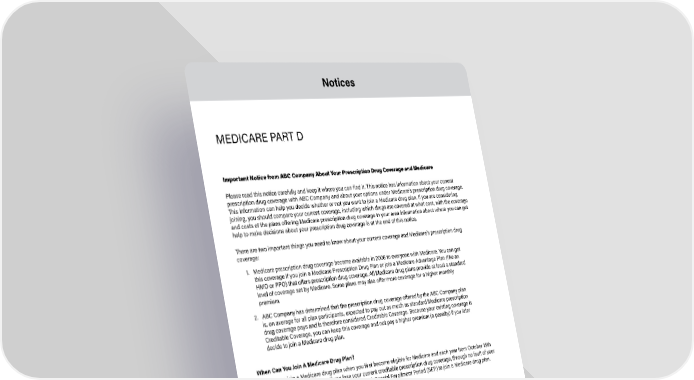 Important Notice from ABC Company About Your Prescription Drug Coverage and Medicare Please read this notice carefully and keep it where you can find it. This notice has information about your current prescription drug coverage with ABC Company and about your options under Medicare’s prescription drug coverage. This information can help you decide whether or not you want to join a Medicare drug plan. If you are considering joining, you should compare your current coverage, including which drugs are covered at what cost, with the coverage and costs of the plans offering Medicare prescription drug coverage in your area Information about where you can get help to make decisions about your prescription drug coverage is at the end of this notice. There are two important things you need to know about your current coverage and Medicare’s prescription drug coverage: 1. Medicare prescription drug coverage became available in 2006 to everyone with Medicare. You can get this coverage if you join a Medicare Prescription Drug Plan or join a Medicare Advantage Plan (like an HMO or PPO) that offers prescription drug coverage. All Medicare drug plans provide at least a standard level of coverage set by Medicare. Some plans may also offer more coverage for a higher monthly premium. 2. ABC Company has determined that the prescription drug coverage offered by the ABC Company plan is, on average for all plan participants, expected to pay out as much as standard Medicare prescription drug coverage pays and is therefore considered Creditable Coverage. Because your existing coverage is Creditable Coverage, you can keep this coverage and not pay a higher premium (a penalty) if you later decide to join a Medicare drug plan. When Can You Join A Medicare Drug Plan? You can join a Medicare drug plan when you first become eligible for Medicare and each year from October 15th to December 7th. However, if you lose your current creditable prescription drug coverage, through no fault of your own, you will also be eligible for a two (2) month Special Enrollment Period (SEP) to join a Medicare drug plan. What Happens To Your Current Coverage If You Decide to Join A Medicare Drug Plan? If you decide to join a Medicare drug plan, your current ABC Company coverage will not be affected. If you do decide to join a Medicare drug plan and drop your current ABC Company coverage, be aware that you and your dependents may not be able to get this coverage back. MEDICARE PART D Notices 5
