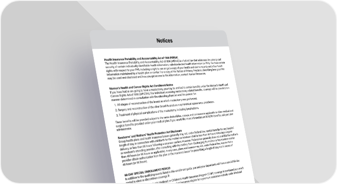 TABLE OF CONTENTS CHIP Notice COBRA General Notice General FMLA Notice Genetic Information Nondiscrimination Act (GINA) Disclosures Health Insurance Exchange Notice (for companies who offer a health plan) Medicare Part D Creditable Coverage Notice Mental Health Parity and Addiction Equity Act (MHPAEA) Disclosure Michelle's Law Notice Newborns’ and Mothers’ Health Protection Act Notice No Surprise Billing Notice of Patient Protections Notice of Privacy Practices Special Enrollment Rights Notice Uniformed Services Employment and Reemployment Rights Act (USERRA) Notice WHCRA Notice