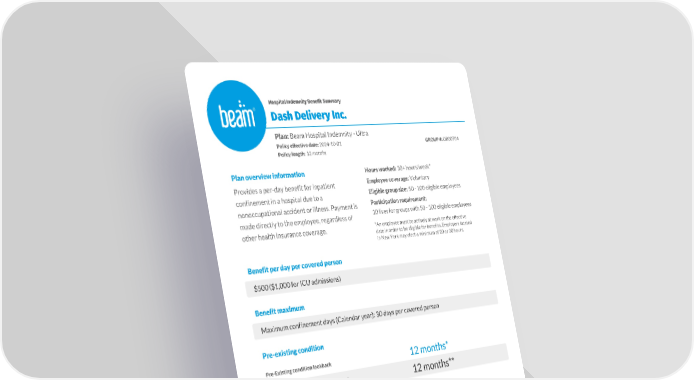 This benefit summary is not a complete description of the insurance coverage. Controlling provisions are provided in the policy, and this summary does not modify those provisions or the insurance in any way. This is not a binding contract. A certificate of coverage will be made available to you that describes the benefits in greater details. Should there be a difference between this summary and the contract, the contract will govern. Hospital only Indemnity insurance product is underwritten by Nationwide Life Insurance Company, Columbus, OH, marketed by Beam Insurance Services LLC (Beam Benefits Insurance Services LLC, in CA) and administered by Beam Insurance Administrators LLC (Beam Dental Insurance Administrators LLC in Texas). Hospital coverage applicable to policy form GHOI AO L20, or state equivalent. Products are not available to members living in Puerto Rico and product availability may vary by state. Program restrictions and exclusions apply. 1099 contractors are not eligible for coverage. Nationwide and Beam Insurance Services LLC are separate and non-affiliated companies. Nationwide Life Insurance Company, One Nationwide Plaza, Columbus, OH 43215 BEAM SUPPORT LEARN MORE support@beambenefits.com | (800) 648 1179 beambenefits.com BM-SOB-0038-202401 3 of 3