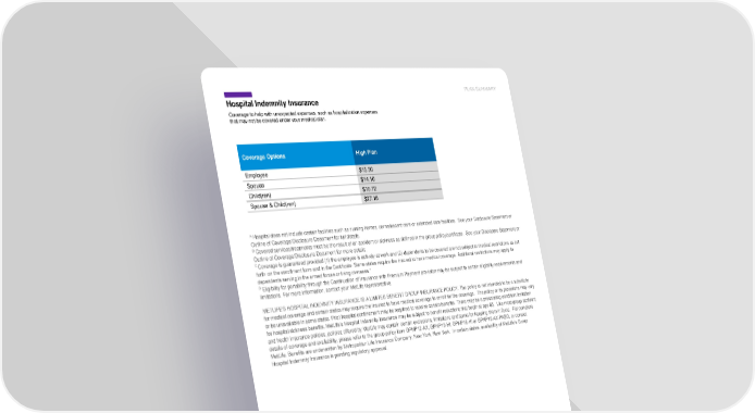 PLAN SUMMARY Hospital Indemnity Insurance Metropolitan Life Insurance Company | 200 Park Avenue | New York, NY 10166 L0724041828[exp0726][All States][DC,GU,MP,PR,VI] © 2024 MetLife Services and Solutions, LLC HI16 ADF# HI1993.18 Coverage to help with unexpected expenses, such as hospitalization expenses that may not be covered under your medical plan. Coverage Options High Plan Employee $15.30 Spouse $14.10 Child(ren) $10.72 Spouse & Child(ren) $27.18 A Hospital does not include certain facilities such as nursing homes, convalescent care or extended care facilities. See your Disclosure Statement or Outline of Coverage/Disclosure Document for full details. B Covered services/treatments must be the result of an accident or sickness as defined in the group policy/certificate. See your Disclosure Statement or Outline of Coverage/Disclosure Document for more details. C Coverage is guaranteed provided (1) the employee is actively at work and (2) dependents to be covered are not subject to medical restrictions as set forth on the enrollment form and in the Certificate. Some states require the insured to have medical coverage. Additional restrictions may apply to dependents serving in the armed forces or living overseas.” D Eligibility for portability through the Continuation of Insurance with Premium Payment provision may be subject to certain eligibility requirements and limitations. For more information, contact your MetLife representative. METLIFE'S HOSPITAL INDEMNITY INSURANCE IS A LIMITED BENEFIT GROUP INSURANCE POLICY. The policy is not intended to be a substitute for medical coverage and certain states may require the insured to have medical coverage to enroll for the coverage. The policy or its provisions may vary or be unavailable in some states. Prior hospital confinement may be required to receive certain benefits. There may be a preexisting condition limitation for hospital sickness benefits. MetLife’s Hospital Indemnity Insurance may be subject to benefit reductions that begin at age 65. Like most group accident and health insurance policies, policies offered by MetLife may contain certain exclusions, limitations and terms for keeping them in force. For complete details of coverage and availability, please refer to the group policy form GPNP12-AX, GPNP13-HI, GPNP16-HI or GPNP12-AX-PASG, or contact MetLife. Benefits are underwritten by Metropolitan Life Insurance Company, New York, New York. In certain states, availability of MetLife’s Group Hospital Indemnity Insurance is pending regulatory approval.
