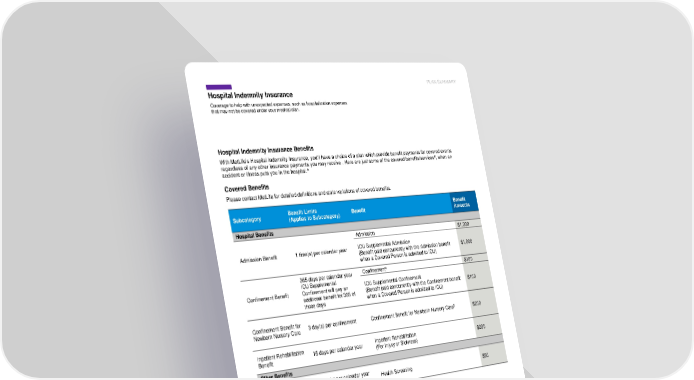 PLAN SUMMARY Hospital Indemnity Insurance Metropolitan Life Insurance Company | 200 Park Avenue | New York, NY 10166 L0724041828[exp0726][All States][DC,GU,MP,PR,VI] © 2024 MetLife Services and Solutions, LLC HI16 ADF# HI1993.18 Coverage to help with unexpected expenses, such as hospitalization expenses that may not be covered under your medical plan. Hospital Indemnity Insurance Benefits With MetLife’s Hospital Indemnity Insurance, you’ll have a choice of a plan which provide benefit payments for covered events regardless of any other insurance payments you may receive . Here are just some of the covered benefits/servicesB, when an accident or illness puts you in the hospital.A Covered Benefits Please contact MetLife for detailed definitions and state variations of covered benefits. Subcategory Benefit Limits (Applies to Subcategory) Benefit Benefit Amounts Hospital Benefits Admission Benefit 1 time(s) per calendar year Admission $1,000 ICU Supplemental Admission (Benefit paid concurrently with the Admission benefit when a Covered Person is admitted to ICU) $1,000 Confinement Benefit 365 days per calendar year ICU Supplemental Confinement will pay an additional benefit for 365 of those days Confinement⁴ $100 ICU Supplemental Confinement (Benefit paid concurrently with the Confinement benefit when a Covered Person is admitted to ICU) $100 Confinement Benefit for Newborn Nursery Care 3 day(s) per confinement Confinement Benefit for Newborn Nursery Care5 $200 Inpatient Rehabilitation Benefit 15 days per calendar year Inpatient Rehabilitation (For Injury or Sickness) $200 Other Benefits Health Screening Benefit7 1 time(s) per calendar year per covered person Health Screening $50 *Any benefit(s) marked with an asterisk requires a prior Hospital Admission or Confinement. 4 If the Admission Benefit is payable for a Confinement, the Confinement Benefit will begin to be payable the day after Admission. 5 Payable for the period of newborn confinement for a newborn child who is not sick or injured. 7 In certain states, the Health Screening Benefit is provided by MetLife Consumer Services as a separate service and is not part of the insurance coverage. This does not impact the Health Screening Benefit’s availability, cost, or the way in which the service is accessed. The covered health screenings are: Routine health check-up exam (annual physical exam), biopsies for cancer, blood chemistry panel, blood test to determine total cholesterol, blood test to determine triglycerides, bone marrow testing, breast MRI, breast ultrasound, breast sonogram, cancer antigen 15-3 blood test for breast cancer (CA 15-3), cancer antigen 125 blood test for ovarian cancer (CA 125), carcinoembryonic antigen blood test for colon cancer (CEA), carotid doppler, complete blood count (CBC), chest x-rays, clinical testicular exam, colonoscopy, coronavirus testing, dental exam , digital rectal exam (DRE), Doppler screening for cancer, Doppler screening for peripheral vascular disease, Echocardiogram, electrocardiogram (EKG), electroencephalogram (EEG), endoscopy, eye exam, fasting blood glucose test, fasting plasma glucose test, flexible sigmoidoscopy, hearing test, hemoccult stool specimen, hemoglobin A1C, human papillomavirus (HPV) vaccination, immunization, lipid panel, mammogram, oral cancer screening, pap smears or thin prep pap test, prostate-specific antigen (PSA) test, serum cholesterol test to determine LDL and HDL levels, serum protein electrophoresis, skin cancer biopsy, skin cancer screening, skin exam, stress test on bicycle or treadmill , successful completion of smoking cessation program, tests for sexually transmitted infections (STIs), thermography, two hour post-load plasma glucose test, ultrasounds for cancer detection, ultrasound screening of the abdominal aorta for abdominal aortic aneurysms and virtual colonoscopy . For groups sitused in CA, the following health