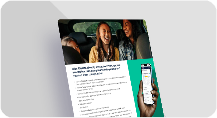 With Allstate Identity Protection Pro+, get ad- vanced features designed to help you defend yourself from today’s risks: • Allstate Digital Footprint®, our proprietary privacy tool, shows where your data lives online and how it might be exposed‡ • Allstate Security Pro® delivers updates and education on scams and emerging threats relevant to you • Identity Health Status gives you at-a-glance insight into your risk • Comprehensive identity and financial monitoring • Dark web monitoring • Robocall blocker‡ • Ad blocker‡ • Social media account takeover monitoring • Tri-bureau credit monitoring with annual reporting and credit score • Lock your TransUnion credit report in a click and get credit freeze assistance • Protect yourself and your family (everyone that’s “under your roof or wallet”)∆ • Get senior family coverage for parents, in-laws, and grandparents age 65+∆, plus access our Elder Fraud Center with specialized scam support • Family digital safety tools that include web filtering, screen time management, and location tracking to help keep kids safe∆‡ • Full-service identity restoration support • Up to $2 million in expense reimbursement for stolen funds and out-of-pocket costs due to identity theft† † Identity theft insurance covering expense and stolen funds reimbursement is underwritten by American Bankers Insurance Company of Florida, an Assurant company. The description herein is a summary and intended for information purposes only and does not include all terms, conditions and exclusions of the policies described. Please refer to the actual policies for terms, conditions, and exclusions of coverage. Coverage may not be available in all jurisdictions. ∆ Only available with a family plan. ‡ Some features require additional activation. For family plans, activation of features such as robocall blocker (up to 10 phone numbers), ad blocker, cybersecurity (up to 10 devices) and family digital safety features can be done only through the primary subscriber’s account. Privacy management features cover up to five email addresses. Products and features are subject to change. Certain features require additional activation and may have additional terms. Allstate Identity Protection is offered and serviced by InfoArmor, Inc., a subsidiary of The Allstate Corporation. Plans and pricing $9.45 per person/month $15.95 per family/month Questions? 1.800.789.2720 or visit myaip.com AIP_OE_SUBSCRIBERFLYER_PRO+_VOLBEN_062024