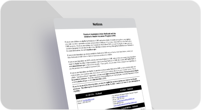 Notices Premium Assistance Under Medicaid and the Children’s Health Insurance Program (CHIP) If you or your children are eligible for Medicaid or CHIP and you’re eligible for health coverage from your employer, your state may have a premium assistance program that can help pay for coverage, using funds from their Medicaid or CHIP programs. If you or your children aren’t eligible for Medicaid or CHIP, you won’t be eligible for these premium assistance programs but you may be able to buy individual insurance coverage through the Health Insurance Marketplace. For more information, visit www.healthcare.gov. If you or your dependents are already enrolled in Medicaid or CHIP and you live in a State listed below, contact your State Medicaid or CHIP office to find out if premium assistance is available. If you or your dependents are NOT currently enrolled in Medicaid or CHIP, and you think you or any of your dependents might be eligible for either of these programs, contact your State Medicaid or CHIP office or dial 1-877-KIDS NOW or www.insurekidsnow.gov to find out how to apply. If you qualify, ask your state if it has a program that might help you pay the premiums for an employer-sponsored plan. If you or your dependents are eligible for premium assistance under Medicaid or CHIP, as well as eligible under your employer plan, your employer must allow you to enroll in your employer plan if you aren’t already enrolled. This is called a “special enrollment” opportunity, and you must request coverage within 60 days of being determined eligible for premium assistance. If you have questions about enrolling in your employer plan, contact the Department of Labor at www.askebsa.dol.gov or call 1-866-444-EBSA (3272). If you live in one of the following states, you may be eligible for assistance paying your employer health plan premiums. The following list of states is current as of July 31, 2025. Contact your State for more information on eligibility – ALABAMA – Medicaid ALASKA – Medicaid Website: http://myalhipp.com/ Phone: 1-855-692-5447 The AK Health Insurance Premium Payment Program Website: http://myakhipp.com/ Phone: 1-866-251-4861 Email: [email protected] Medicaid Eligibility: https://health.alaska.gov/dpa/Pages/default.aspx ARKANSAS – Medicaid CALIFORNIA – Medicaid Website: http://myarhipp.com/ Phone: 1-855-MyARHIPP (855-692-7447) Health Insurance Premium Payment (HIPP) Program Website: http://dhcs.ca.gov/hipp Phone: 916-445-8322 Fax: 916-440-5676 Email: [email protected] COLORADO – Health First Colorado (Colorado’s Medicaid Program) & Child Health Plan Plus (CHP+) FLORIDA – Medicaid Health First Colorado Website: https://www.healthfirstcolorado.com/ Health First Colorado Member Contact Center: 1-800-221-3943/State Relay 711 CHP+: https://hcpf.colorado.gov/child-health-plan-plus CHP+ Customer Service: 1-800-359-1991/State Relay 711 Health Insurance Buy-In Program (HIBI): https://www.mycohibi.com/ HIBI Customer Service: 1-855-692-6442 Website: https://www.flmedicaidtplrecovery.com/flmedicaidtplrecover y.com/hipp/index.html Phone: 1-877-357-3268 7