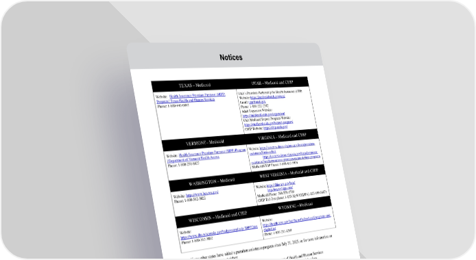 TEXAS – Medicaid UTAH – Medicaid and CHIP Website: Health Insurance Premium Payment (HIPP) Program | Texas Health and Human Services Phone: 1-800-440-0493 Utah’s Premium Partnership for Health Insurance (UPP) Website: https://medicaid.utah.gov/upp/ Email: [email protected] Phone: 1-888-222-2542 Adult Expansion Website: https://medicaid.utah.gov/expansion/ Utah Medicaid Buyout Program Website: https://medicaid.utah.gov/buyout-program/ CHIP Website: https://chip.utah.gov/ VERMONT– Medicaid VIRGINIA – Medicaid and CHIP Website: Health Insurance Premium Payment (HIPP) Program | Department of Vermont Health Access Phone: 1-800-250-8427 Website: https://coverva.dmas.virginia.gov/learn/premium- assistance/famis-select https://coverva.dmas.virginia.gov/learn/premium- assistance/health-insurance-premium-payment-hipp-programs Medicaid/CHIP Phone: 1-800-432-5924 WASHINGTON – Medicaid WEST VIRGINIA – Medicaid and CHIP Website: https://www.hca.wa.gov/ Phone: 1-800-562-3022 Website: https://dhhr.wv.gov/bms/ http://mywvhipp.com/ Medicaid Phone: 304-558-1700 CHIP Toll-free phone: 1-855-MyWVHIPP (1-855-699-8447) WISCONSIN – Medicaid and CHIP WYOMING – Medicaid Website: https://www.dhs.wisconsin.gov/badgercareplus/p-10095.htm Phone: 1-800-362-3002 Website: https://health.wyo.gov/healthcarefin/medicaid/programs-and- eligibility/ Phone: 1-800-251-1269 To see if any other states have added a premium assistance program since July 31, 2025, or for more information on special enrollment rights, contact either: U.S. Department of Labor U.S. Department of Health and Human Services Employee Benefits Security Administration Centers for Medicare & Medicaid Services www.dol.gov/agencies/ebsa www.cms.hhs.gov 1-866-444-EBSA (3272) 1-877-267-2323, Menu Option 4, Ext. 61565 Paperwork Reduction Act Statement According to the Paperwork Reduction Act of 1995 (Pub. L. 104-13) (PRA), no persons are required to respond to a collection of information unless such collection displays a valid Office of Management and Budget (OMB) control number. The Department notes that a Federal agency cannot conduct or sponsor a collection of information unless it is approved by OMB under the PRA, and displays a currently valid OMB control number, and the public is not required to respond to a collection of information unless it displays a currently valid OMB control number. See 44 U.S.C. 3507. Also, notwithstanding any other provisions of law, no person shall be subject to penalty for failing to comply with a collection of information if the collection of information does not display a currently valid OMB control number. See 44 U.S.C. 3512. The public reporting burden for this collection of information is estimated to average approximately seven minutes per respondent. Interested parties are encouraged to send comments regarding the burden estimate or any other aspect of this collection of information, including suggestions for reducing this burden, to the U.S. Department of Labor, Employee Benefits Security Administration, Office of Policy and Research, Attention: PRA Clearance Officer, 200 Constitution Avenue, N.W., Room N-5718, Washington, DC 20210 or email [email protected] and reference the OMB Control Number 1210-0137. OMB Control Number 1210-0137 (expires 1/31/2026) Notices 10