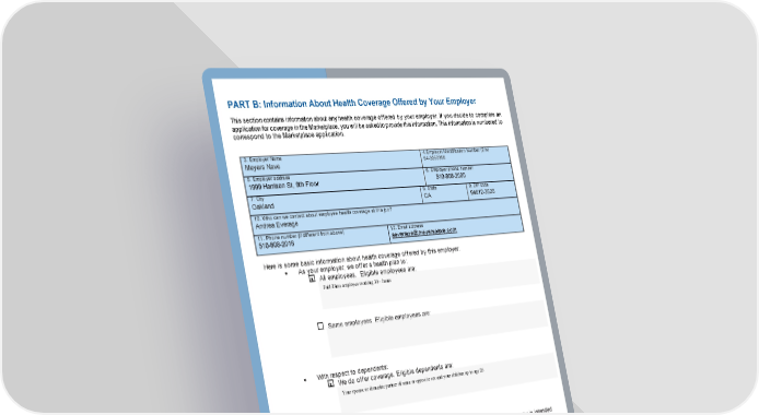 PART B: Information About Health Coverage Offered by Your Employer This section contains information about any health coverage offered by your employer. If you decide to complete an application for coverage in the Marketplace, you will be asked to provide this information. This information is numbered to correspond to the Marketplace application. 3. Employer Name Meyers Nave 4.Employer Identification Number (EIN) 94-3050358 5. Employer address 1999 Harrison St, 9th Floor 6. Employer phone number 510-808-2000 7. City Oakland 8. State CA 9. ZIP code 94612-3520 10. Who can we contact about employee health coverage at this job? Andrea Everage 11. Phone number (if different from above) 510-808-2016 12. Email address aeverage@meyersnave.com Here is some basic information about health coverage offered by this employer: • As your employer, we offer a health plan to: All employees. Eligible employees are: Some employees. Eligible employees are: • With respect to dependents: We do offer coverage. Eligible dependents are: We do not offer coverage. If checked, this coverage meets the minimum value standard, and the cost of this coverage to you is intended to be affordable, based on employee wages. ** Even if your employer intends your coverage to be affordable, you may still be eligible for a premium discount through the Marketplace. The Marketplace will use your household income, along with other factors, to determine whether you may be eligible for a premium discount. If, for example, your wages vary from week to week (perhaps you are an hourly employee or you work on a commission basis), if you are newly employed mid-year, or if you have other income losses, you may still qualify for a premium discount. If you decide to shop for coverage in the Marketplace, HealthCare.gov will guide you through the process. Here's the employer information you'll enter when you visit HealthCare.gov to find out if you can get a tax credit to lower your monthly premiums. x x Full-Time employee working 30+ hours Your spouse or domestic partner of same or opposite sex and your children up to age 26
