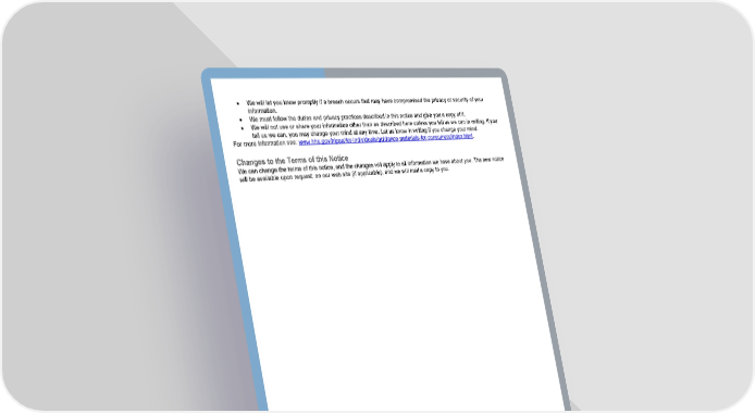 Page 9 of 20 We will let you know promptly if a breach occurs that may have compromised the privacy or security of your information. We must follow the duties and privacy practices described in this notice and give you a copy of it. We will not use or share your information other than as described here unless you tell us we can in writing. If you tell us we can, you may change your mind at any time. Let us know in writing if you change your mind. For more information see: www.hhs.gov/hipaa/for-individuals/guidance-materials-for-consumers/index.html. Changes to the Terms of this Notice We can change the terms of this notice, and the changes will apply to all information we have about you. The new notice will be available upon request, on our web site (if applicable), and we will mail a copy to you.