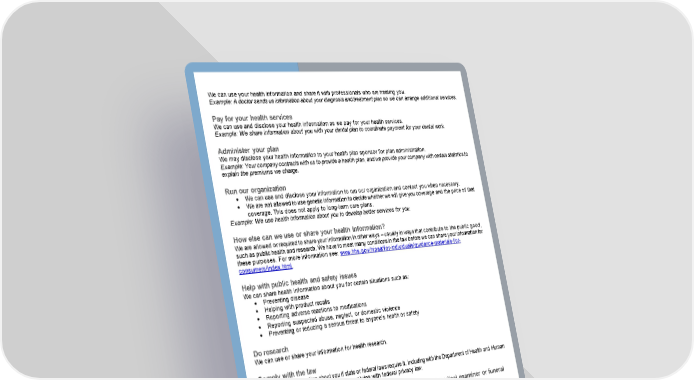 Page 8 of 20 We can use your health information and share it with professionals who are treating you. Example: A doctor sends us information about your diagnosis and treatment plan so we can arrange additional services. Pay for your health services We can use and disclose your health information as we pay for your health services. Example: We share information about you with your dental plan to coordinate payment for your dental work. Administer your plan We may disclose your health information to your health plan sponsor for plan administration. Example: Your company contracts with us to provide a health plan, and we provide your company with certain statistics to explain the premiums we charge. Run our organization • We can use and disclose your information to run our organization and contact you when necessary. • We are not allowed to use genetic information to decide whether we will give you coverage and the price of that coverage. This does not apply to long-term care plans. Example: We use health information about you to develop better services for you. How else can we use or share your health information? We are allowed or required to share your information in other ways – usually in ways that contribute to the public good, such as public health and research. We have to meet many conditions in the law before we can share your information for these purposes. For more information see: www.hhs.gov/hipaa/for-individuals/guidance-materials-for- consumers/index.html. Help with public health and safety issues We can share health information about you for certain situations such as: • Preventing disease • Helping with product recalls • Reporting adverse reactions to medications • Reporting suspected abuse, neglect, or domestic violence • Preventing or reducing a serious threat to anyone’s health or safety Do research We can use or share your information for health research. Comply with the law We will share information about you if state or federal laws require it, including with the Department of Health and Human Services if it wants to see that we’re complying with federal privacy law. Respond to organ and tissue donation requests and work with a medical examiner or funeral director • We can share health information about you with organ procurement organizations. • We can share health information with a coroner, medical examiner, or funeral director when an individual dies. Address workers’ compensation, law enforcement, and other government requests We can use or share health information about you: • For workers’ compensation claims • For law enforcement purposes or with a law enforcement official • With health oversight agencies for activities authorized by law • For special government functions such as military, national security, and presidential protective services Respond to lawsuits and legal actions We can share health information about you in response to a court or administrative order, or in response to a subpoena.