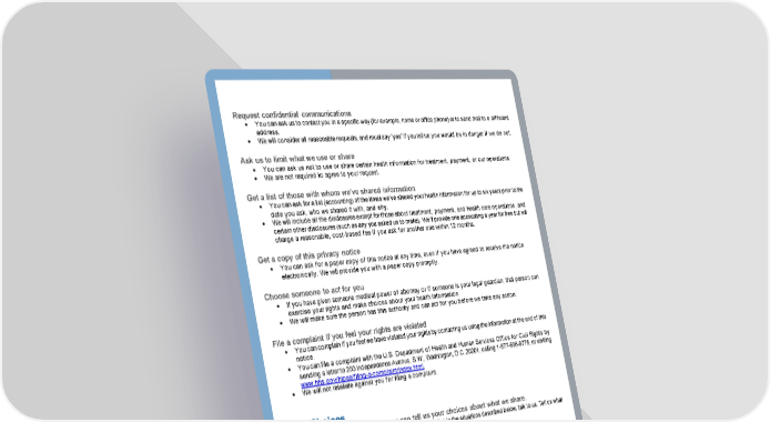 Page 7 of 20 Request confidential communications • You can ask us to contact you in a specific way (for example, home or office phone) or to send mail to a different address. • We will consider all reasonable requests, and must say “yes” if you tell us you would be in danger if we do not. Ask us to limit what we use or share • You can ask us not to use or share certain health information for treatment, payment, or our operations. • We are not required to agree to your request. Get a list of those with whom we’ve shared information • You can ask for a list (accounting) of the times we’ve shared your health information for up to six years prior to the date you ask, who we shared it with, and why. • We will include all the disclosures except for those about treatment, payment, and health care operations, and certain other disclosures (such as any you asked us to make). We’ll provide one accounting a year for free but will charge a reasonable, cost-based fee if you ask for another one within 12 months. Get a copy of this privacy notice • You can ask for a paper copy of this notice at any time, even if you have agreed to receive the notice electronically. We will provide you with a paper copy promptly. Choose someone to act for you • If you have given someone medical power of attorney or if someone is your legal guardian, that person can exercise your rights and make choices about your health information. • We will make sure the person has this authority and can act for you before we take any action. File a complaint if you feel your rights are violated • You can complain if you feel we have violated your rights by contacting us using the information at the end of this notice. • You can file a complaint with the U.S. Department of Health and Human Services Office for Civil Rights by sending a letter to 200 Independence Avenue, S.W., Washington, D.C. 20201, calling 1-877-696-6775, or visiting www.hhs.gov/hipaa/filing-a-complaint/index.html. • We will not retaliate against you for filing a complaint. Your Choices For certain health information, you can tell us your choices about what we share. If you have a clear preference for how we share your information in the situations described below, talk to us. Tell us what you want us to do, and we will follow your instructions. In these cases, you have both the right and choice to tell us to: • Share information with your family, close friends, or others involved in payment for your care • Share information in a disaster relief situation If you are not able to tell us your preference, for example if you are unconscious, we may go ahead and share your information if we believe it is in your best interest. We may also share your information when needed to lessen a serious and imminent threat to health or safety. • In these cases, we never share your information unless you give us written permission: Marketing purposes Sale of your information Our Uses and Disclosures How do we typically use or share your health information? We typically use or share your health information in the following ways. Help manage the health care treatment you receive