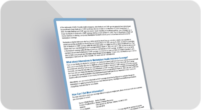 Page 18 of 20 of the nationwide COVID-19 public health emergency, state Medicaid and CHIP agencies generally have not terminated the enrollment of any Medicaid or CHIP beneficiary who was enrolled on or after March 18, 2020, through March 31, 2023. As state Medicaid and CHIP agencies resume regular eligibility and enrollment practices, many individuals may no longer be eligible for Medicaid or CHIP coverage starting as early as March 31, 2023. The U.S. Department of Health and Human Services is offering a temporary Marketplace Special Enrollment period to allow these individuals to enroll in Marketplace coverage. Marketplace-eligible individuals who live in states served by HealthCare.gov and either- submit a new application or update an existing application on HealthCare.gov between March 31, 2023, and July 31, 2024, and attest to a termination date of Medicaid or CHIP coverage within the same time period, are eligible for a 60-day Special Enrollment Period. That means that if you lose Medicaid or CHIP coverage between March 31, 2023, and July 31, 2024, you may be able to enroll in Marketplace coverage within 60 days of when you lost Medicaid or CHIP coverage. In addition, if you or your family members are enrolled in Medicaid or CHIP coverage, it is important to make sure that your contact information is up to date to make sure you get any information about changes to your eligibility. To learn more, visit HealthCare.gov or call the Marketplace Call Center at 1-800-318-2596. TTY users can call 1-855-889-4325. What about Alternatives to Marketplace Health Insurance Coverage? If you or your family are eligible for coverage in an employment-based health plan (such as an employer-sponsored health plan), you or your family may also be eligible for a Special Enrollment Period to enroll in that health plan in certain circumstances, including if you or your dependents were enrolled in Medicaid or CHIP coverage and lost that coverage. Generally, you have 60 days after the loss of Medicaid or CHIP coverage to enroll in an employment-based health plan, but if you and your family lost eligibility for Medicaid or CHIP coverage between March 31, 2023, and July 10, 2023, you can request this special enrollment in the employment-based health plan through September 8, 2023. Confirm the deadline with your employer or your employment-based health plan. Alternatively, you can enroll in Medicaid or CHIP coverage at any time by filling out an application through the Marketplace or applying directly through your state Medicaid agency. Visit https://www.healthcare.gov/medicaid- chip/getting-medicaid-chip/ for more details. How Can I Get More Information? For more information about your coverage offered through your employment, please check your health plan’s summary plan description or contact: Name of Entity/Sender: Andrea Everage Contact--Position/Office: Director of Human Resources Address: 1999 Harrison St, 9th Floor, Oakland, CA 94612-3520 Phone Number: 510-808-2016 The Marketplace can help you evaluate your coverage options, including your eligibility for coverage through the Marketplace and its cost. Please visit HealthCare.gov for more information, including an online application for health insurance coverage and contact information for a Health Insurance Marketplace in your area.