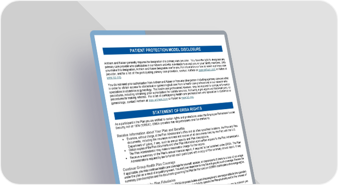 Page 3 of 20 Anthem and Kaiser generally requires the designation of a primary care provider. You have the right to designate any primary care provider who participates in our network and who is available to accept you or your family members. Until you make this designation, Anthem and Kaiser designates one for you. For information on how to select a primary care provider, and for a list of the participating primary care providers, contact Anthem at www.anthem.com or Kaiser at www.kp.org. You do not need prior authorization from Anthem and Kaiser or from any other person (including a primary care provider) in order to obtain access to obstetrical or gynecological care from a health care professional in our network who specializes in obstetrics or gynecology. The health care professional, however, may be required to comply with certain procedures, including obtaining prior authorization for certain services, following a pre-approved treatment plan, or procedures for making referrals. For a list of participating health care professionals who specialize in obstetrics or gynecology, contact Anthem at www.anthem.com or Kaiser at www.kp.org. As a participant in the Plan you are entitled to certain rights and protections under the Employee Retirement Income Security Act of 1974 (“ERISA”). ERISA provides that all participants shall be entitled to: Receive Information about Your Plan and Benefits • Examine, without charge, at the Plan Administrator’s office and at other specified locations, the Plan and Plan documents, including the insurance contract and copies of all documents filed by the Plan with the U.S. Department of Labor, if any, such as annual reports and Plan descriptions. • Obtain copies of the Plan documents and other Plan information upon written request to the Plan Administrator. The Plan Administrator may make a reasonable charge for the copies. • Receive a summary of the Plan’s annual financial report, if required to be furnished under ERISA. The Plan Administrator is required by law to furnish each participant with a copy of this summary annual report, if any. Continue Group Health Plan Coverage If applicable, you may continue health care coverage for yourself, spouse, or dependents if there is a loss of coverage under the plan as a result of a qualifying event. You and your dependents may have to pay for such coverage. Review the summary plan description and the documents governing the Plan for the rules on COBRA continuation of coverage rights. Prudent Actions by Plan Fiduciaries In addition to creating rights for participants, ERISA imposes duties upon the people who are responsible for the operation of the Plan. These people, called “fiduciaries” of the Plan, have a duty to operate the Plan prudently and in the interest of you and other Plan participants. No one, including the Company or any other person, may fire you or discriminate against you in any way to prevent you from obtaining welfare benefits or exercising your rights under ERISA. Enforce your Rights If your claim for a welfare benefit is denied in whole or in part, you must receive a written explanation of the reason for the denial. You have a right to have the Plan reviewed and reconsider your claim. Under ERISA, there are steps you can take to enforce these rights. For instance, if you request materials from the Plan Administrator and do not receive them within 30 days, you may file suit in federal court. In such a case, the court may require the Plan Administrator to provide the materials and pay you up to $110 per day, until you receive the materials, unless the materials were not sent due to reasons beyond the control of the Plan Administrator. If you have a claim for benefits which is denied or ignored, in whole or in part, and you have exhausted the available claims procedures under the Plan, you may file suit in a state or federal court. If it should happen that Plan fiduciaries misuse the Plan’s money, o r if you are discriminated against for asserting your rights, you may seek assistance from the U.S. Department of Labor, or you may file suit in a federal court. The court will decide who should pay court costs and legal fees. If you are successful, the court may order the person you have sued to pay these costs and fees. If you lose (for example, if the court finds your claim is frivolous) the court may order you to pay these costs and fees. PATIENT PROTECTION MODEL DISCLOSURE STATEMENT OF ERISA RIGHTS