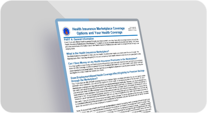 Page 17 of 20 Health Insurance Marketplace Coverage Options and Your Health Coverage PART A: General Information Even if you are offered health coverage through your employment, you may have other coverage options through the Health Insurance Marketplace (“Marketplace”). To assist you as you evaluate options for you and your family, this notice provides some basic information about the Health Insurance Marketplace and health coverage offered through your employment. What is the Health Insurance Marketplace? The Marketplace is designed to help you find health insurance that meets your needs and fits your budget. The Marketplace offers "one-stop shopping" to find and compare private health insurance options in your geographic area. Can I Save Money on my Health Insurance Premiums in the Marketplace? You may qualify to save money and lower your monthly premium and other out-of-pocket costs, but only if your employer does not offer coverage, or offers coverage that is not considered affordable for you and doesn’t meet certain minimum value standards (discussed below). The savings that you're eligible for depends on your household income. You may also be eligible for a tax credit that lowers your costs. Does Employment-Based Health Coverage Affect Eligibility for Premium Savings through the Marketplace? Yes. If you have an offer of health coverage from your employer that is considered affordable for you and meets certain minimum value standards, you will not be eligible for a tax credit, or advance payment of the tax credit, for your Marketplace coverage and may wish to enroll in your employment-based health plan. However, you may be eligible for a tax credit, and advance payments of the credit that lowers your monthly premium, or a reduction in certain cost-sharing, if your employer does not offer coverage to you at all or does not offer coverage that is considered affordable for you or meet minimum value standards. If your share of the premium cost of all plans offered to you through your employment is more than 9.12%1 of your annual household income, or if the coverage through your employment does not meet the "minimum value" standard set by the Affordable Care Act, you may be eligible for a tax credit, and advance payment of the credit, if you do not enroll in the employment-based health coverage. For family members of the employee, coverage is considered affordable if the employee’s cost of premiums for the lowest-cost plan that would cover all family members does not exceed 9.12% of the employee’s household income. 2 Note: If you purchase a health plan through the Marketplace instead of accepting health coverage offered through your employment, then you may lose access to whatever the employer contributes to the employment-based coverage. Also, this employer contribution – as well as your employee contribution to employment-based coverage – is generally excluded from income for federal and state income tax purposes. Your payments for coverage through the Marketplace are made on an after-tax basis. In addition, note that if the health coverage offered through your employment does not meet the affordability or minimum value standards, but you accept that coverage anyway, you will not be eligible for a tax credit. You should consider all these factors in determining whether to purchase a health plan through the Marketplace. When Can I Enroll in Health Insurance Coverage through the Marketplace? You can enroll in a Marketplace health insurance plan during the annual Marketplace Open Enrollment Period. Open Enrollment varies by state but generally starts November 1 and continues through at least December 15. Outside the annual Open Enrollment Period, you can sign up for health insurance if you qualify for a Special Enrollment Period. In general, you qualify for a Special Enrollment Period if you’ve had certain qualifying life events, such as getting married, having a baby, adopting a child, or losing eligibility for other health coverage. Depending on your Special Enrollment Period type, you may have 60 days before or 60 days following the qualifying life event to enroll in a Marketplace plan. There is also a Marketplace Special Enrollment Period for individuals and their families who lose eligibility for Medicaid or Children’s Health Insurance Program (CHIP) coverage on or after March 31, 2023, through July 31, 2024. Since the onset 1 Indexed annually; see https://www.irs.gov/pub/irs-drop/rp-22-34.pdf for 2023. 2 An employer-sponsored or other employment-based health plan meets the "minimum value standard" if the plan's share of the total allowed benefit costs covered by the plan is no less than 60 percent of such costs. For purposes of eligibility for the premium tax credit, to meet the “minimum value standard,” the health plan must also provide substantial coverage of both inpatient hospital services and physician services. Form Approved OMB No. 1210-0149 (expires 12-31-2026)