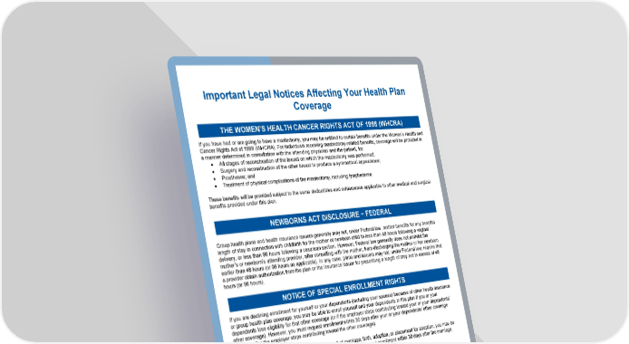 Page 2 of 20 Important Legal Notices Affecting Your Health Plan Coverage If you have had or are going to have a mastectomy, you may be entitled to certain benefits under the Women’s Health and Cancer Rights Act of 1998 (WHCRA). For individuals receiving mastectomy-related benefits, coverage will be provided in a manner determined in consultation with the attending physician and the patient, for: All stages of reconstruction of the breast on which the mastectomy was performed; Surgery and reconstruction of the other breast to produce a symmetrical appearance; Prostheses; and Treatment of physical complications of the mastectomy, including lymphedema. These benefits will be provided subject to the same deductibles and coinsurance applicable to other medical and surgical benefits provided under this plan. Group health plans and health insurance issuers generally may not, under Federal law, restrict benefits for any hospital length of stay in connection with childbirth for the mother or newborn child to less than 48 hours following a vaginal delivery, or less than 96 hours following a cesarean section. However, Federal law generally does not prohibit the mother’s or newborn’s attending provider, after consulting with the mother, from discharging the mother or her newborn earlier than 48 hours (or 96 hours as applicable). In any case, plans and issuers may not, under Federal law, require that a provider obtain authorization from the plan or the insurance issuer for prescribing a length of stay not in excess of 48 hours (or 96 hours). If you are declining enrollment for yourself or your dependents (including your spouse) because of other health insurance or group health plan coverage, you may be able to enroll yourself and your dependents in this plan if you or your dependents lose eligibility for that other coverage (or if the employer stops contributing toward your or your dependents’ other coverage). However, you must request enrollment within 30 days after your or your dependents’ other coverage ends (or after the employer stops contributing toward the other coverage). In addition, if you have a new dependent as a result of marriage, birth, adoption, or placement for adoption, you may be able to enroll yourself and your dependents. However, you must request enrollment within 30 days after the marriage, birth, adoption, or placement for adoption. Further, if you decline enrollment for yourself or eligible dependents (including your spouse) while Medicaid coverage or coverage under a State CHIP program is in effect, you may be able to enroll yourself and your dependents in this plan if: coverage is lost under Medicaid or a State CHIP program; or you or your dependents become eligible for a premium assistance subsidy from the State. In either case, you must request enrollment within 60 days from the loss of coverage or the date you become eligible for premium assistance. To request special enrollment or obtain more information, contact the person listed at the end of this summary. THE WOMEN’S HEALTH CANCER RIGHTS ACT OF 1998 (WHCRA) NEWBORNS ACT DISCLOSURE − FEDERAL NOTICE OF SPECIAL ENROLLMENT RIGHTS