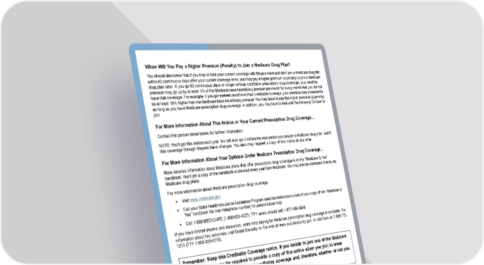 Page 11 of 20 When Will You Pay a Higher Premium (Penalty) to Join a Medicare Drug Plan? You should also know that if you drop or lose your current coverage with Meyers Naveand don’t join a Medicare drug plan within 63 continuous days after your current coverage ends, you may pay a higher premium (a penalty) to join a Medicare drug plan later. If you go 63 continuous days or longer without creditable prescription drug coverage, your monthly premium may go up by at least 1% of the Medicare base beneficiary premium per month for every month that you did not have that coverage. For example, if you go nineteen months without creditable coverage, your premium may consistently be at least 19% higher than the Medicare base beneficiary premium. You may have to pay this higher premium (a penalty) as long as you have Medicare prescription drug coverage. In addition, you may have to wait until the following October to join. For More Information About This Notice or Your Current Prescription Drug Coverage… Contact the person listed below for further information. NOTE: You’ll get this notice each year. You will also get it before the next period you can join a Medicare drug plan, and if this coverage through Meyers Nave changes. You also may request a copy of this notice at any time. For More Information About Your Options Under Medicare Prescription Drug Coverage… More detailed information about Medicare plans that offer prescription drug coverage is in the “Medicare & You” handbook. You’ll get a copy of the handbook in the mail every year from Medicare. You may also be contacted directly by Medicare drug plans. For more information about Medicare prescription drug coverage: • Visit www.medicare.gov • Call your State Health Insurance Assistance Program (see the inside back cover of your copy of the “Medicare & You” handbook for their telephone number) for personalized help • Call 1-800-MEDICARE (1-800-633-4227). TTY users should call 1-877-486-2048. If you have limited income and resources, extra help paying for Medicare prescription drug coverage is available. For information about this extra help, visit Social Security on the web at www.socialsecurity.gov, or call them at 1-800-772- 1213 (TTY 1-800-325-0778). Date: February 11, 2026 Name/Entity of Sender: Andrea Everage Contact Position/Office: Director of Human Resources Address: 1999 Harrison St, 9th Floor, Oakland, CA 94612-3520 Phone Number: 510-808-2016 Remember: Keep this Creditable Coverage notice. If you decide to join one of the Medicare drug plans, you may be required to provide a copy of this notice when you join to show whether or not you have maintained creditable coverage and, therefore, whether or not you are required to pay a higher premium (a penalty).
